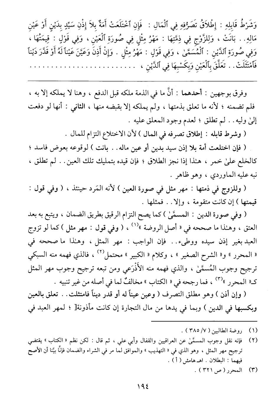 (وفي صورة الدين: المسمَّى) كما يصح التزام الرقيق بطريق الضمان، ويتبع به بعد العتق، وهذا ما صححه في "أصل الروضة" (١)، (وفي قول: مهر مثل) كما لو تزوج العبد بغير إذن سيده ووطئ .. فإن الواجب: مهر المثل، وهذا ما صححه في "المحرر" و"الشرح الصغير"، وكلام "الكبير" محتمل (٢)، فالذي فهمه منه السبكي ترجيح وجوب المُسمَّى، والذي فهمه منه الأَذْرَعي ومن تبعه ترجيح وجوب مهر المثل كـ"المحرر" (٣)، فما رجحه في "الكتاب" مخالفٌ لما في أصله من غير تنبيه.