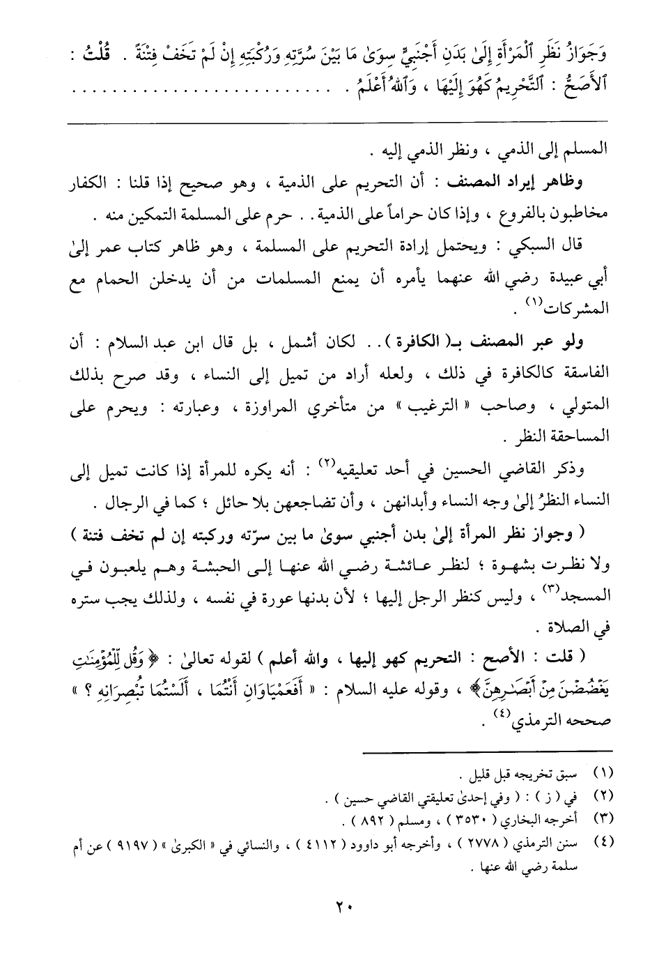 (وجواز نظر المرأة إلى بدن أجنبي سوى ما بين سرّته وركبته إن لم تخف فتنة) ولا نظرت بشهوة؛ لنظر عائشة رضي الله عنها إلى الحبشة وهم يلعبون في المسجد (٣)، وليس كنظر الرجل إليها؛ لأن بدنها عورة في نفسه، ولذلك يجب ستره في الصلاة.
