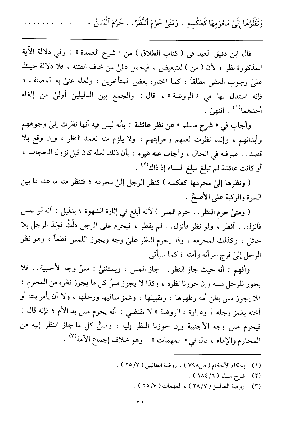 قال ابن دقيق العيد في (كتاب الطلاق) من "شرح العمدة": وفي دلالة الآية المذكورة نظر؛ لأن (من) للتبعيض، فيحمل على من خاف الفتنة، فلا دلالة حينئذ على وجوب الغض مطلقًا؛ كما اختاره بعض المتأخرين، ولعله عنى به المصنف؛ فإنه استدل بها في "الروضة"، قال: والجمع بين الدليلين أولى من إلغاء أحدهما (١). انتهى.