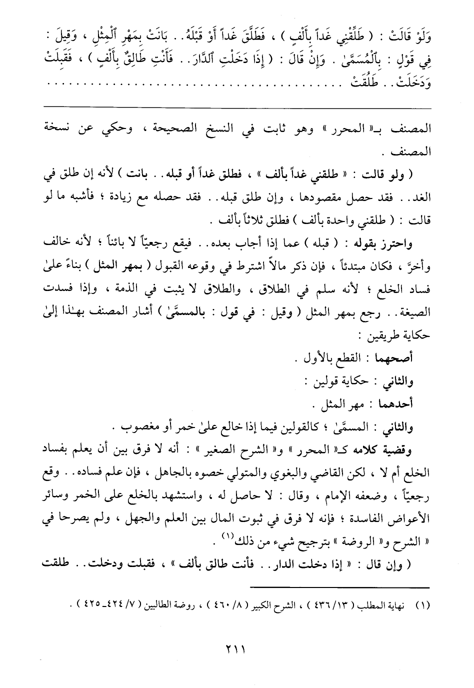 وقضية كلامه كـ"المحرر" و"الشرح الصغير": أنه لا فرق بين أن يعلم بفساد الخلع أم لا، لكن القاضي والبغوي والمتولي خصوه بالجاهل، فإن علم فساده .. وقع رجعيًّا، وضعفه الإمام، وقال: لا حاصل له، واستشهد بالخلع على الخمر وسائر الأعواض الفاسدة؛ فإنه لا فرق في ثبوت المال بين العلم والجهل، ولم يصرحا في "الشرح و"الروضة" بترجيح شيء من ذلك (١).