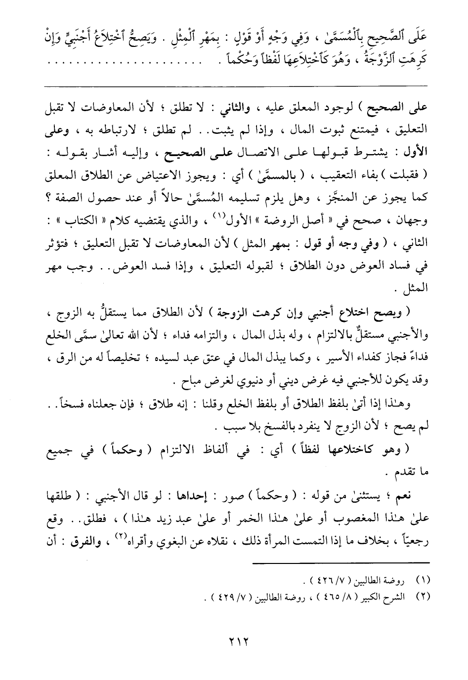 على الصحيح) لوجود المعلق عليه، والثاني: لا تطلق، لأن المعاوضات لا تقبل التعليق، فيمتنع ثبوت المال، وإذا لم يثبت .. لم تطلق؛ لارتباطه به، وعلى الأول: يشترط قبولها على الاتصال على الصحيح، وإليه أشار بقوله: (فقبلت) بفاء التعقيب، (بالمسمَّى) أي: ويجوز الاعتياض عن الطلاق المعلق كما يجوز عن المنجَّز، وهل يلزم تسليمه المُسمَّى حالًا أو عند حصول الصفة؟ وجهان، صحح في "أصل الروضة" الأول (١)، والذي يقتضيه كلام "الكتاب": الثاني، (وفي وجه أو قول: بمهر المثل) لأن المعاوضات لا تقبل التعليق؛ فتؤثر في فساد العوض دون الطلاق، لقبوله التعليق، وإذا فسد العوض .. وجب مهر المثل.