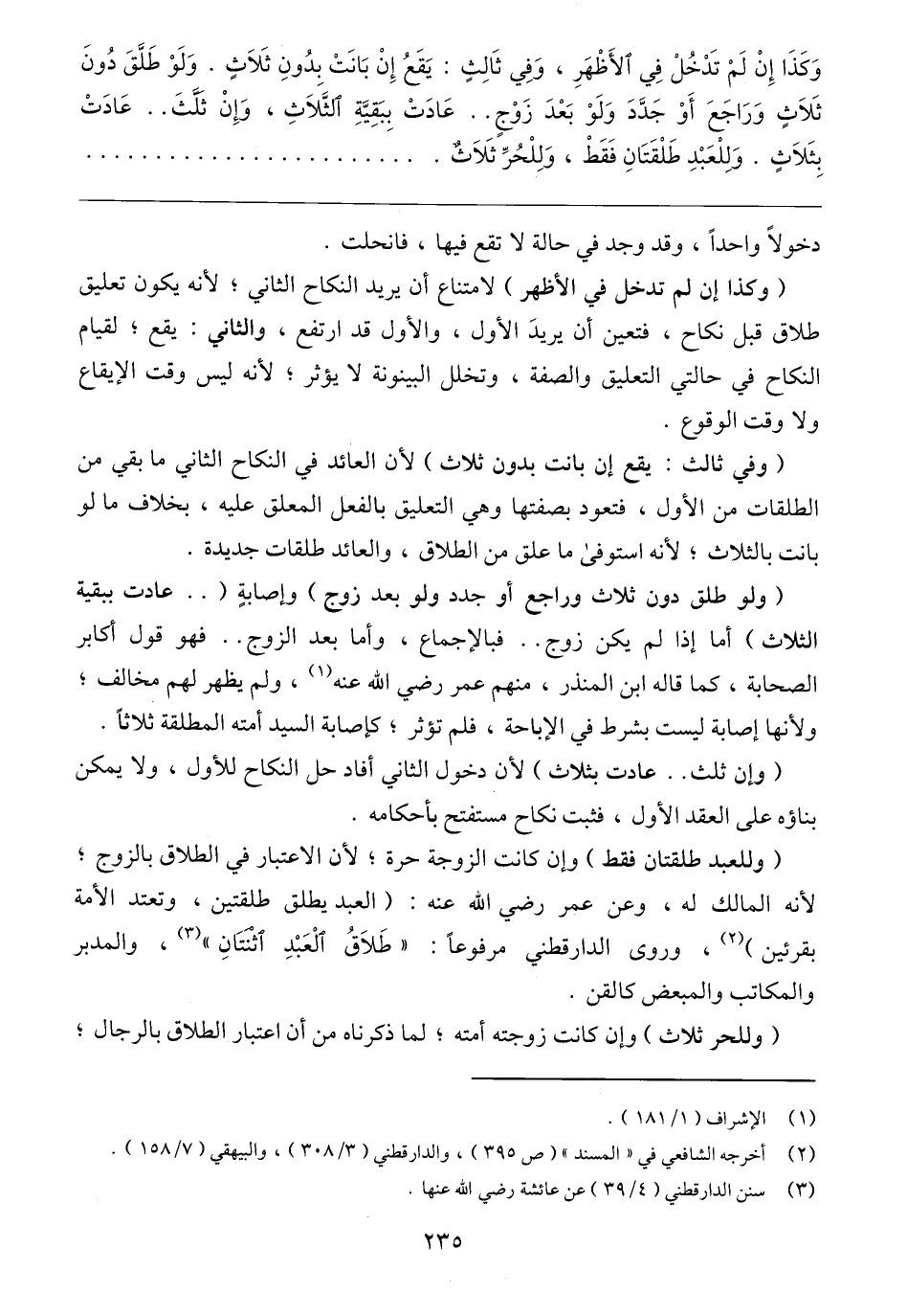 (وللعبد طلقتان فقط) وإن كانت الزوجة حرة؛ لأن الاعتبار في الطلاق بالزوج؛ لأنه المالك له، وعن عمر رضي الله عنه: (العبد يطلق طلقتين، وتعتد الأمة بقرئين) (٢)، وروى الدارقطني مرفوعًا: "طَلَاقُ الْعَبْدِ اثنتَانِ" (٣)، والمدبر والمكاتب والمبعض كالقن.