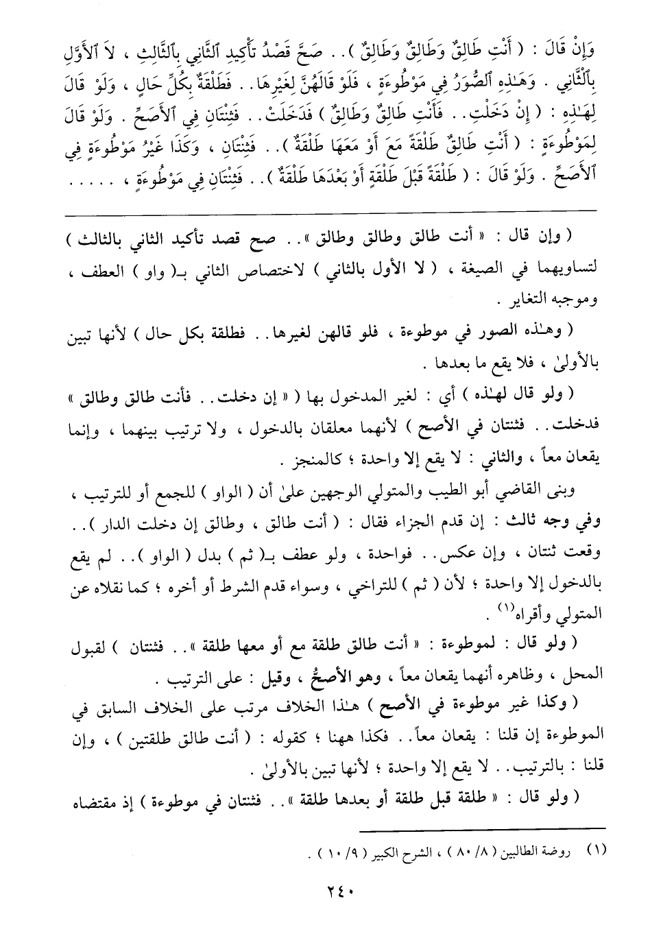 (وإن قال: "أنت طالق وطالق وطالق " .. صح قصد تأكيد الثاني بالثالث) لتساويهما في الصيغة، (لا الأول بالثاني) لاختصاص الثاني بـ (واو) العطف، وموجبه التغاير.