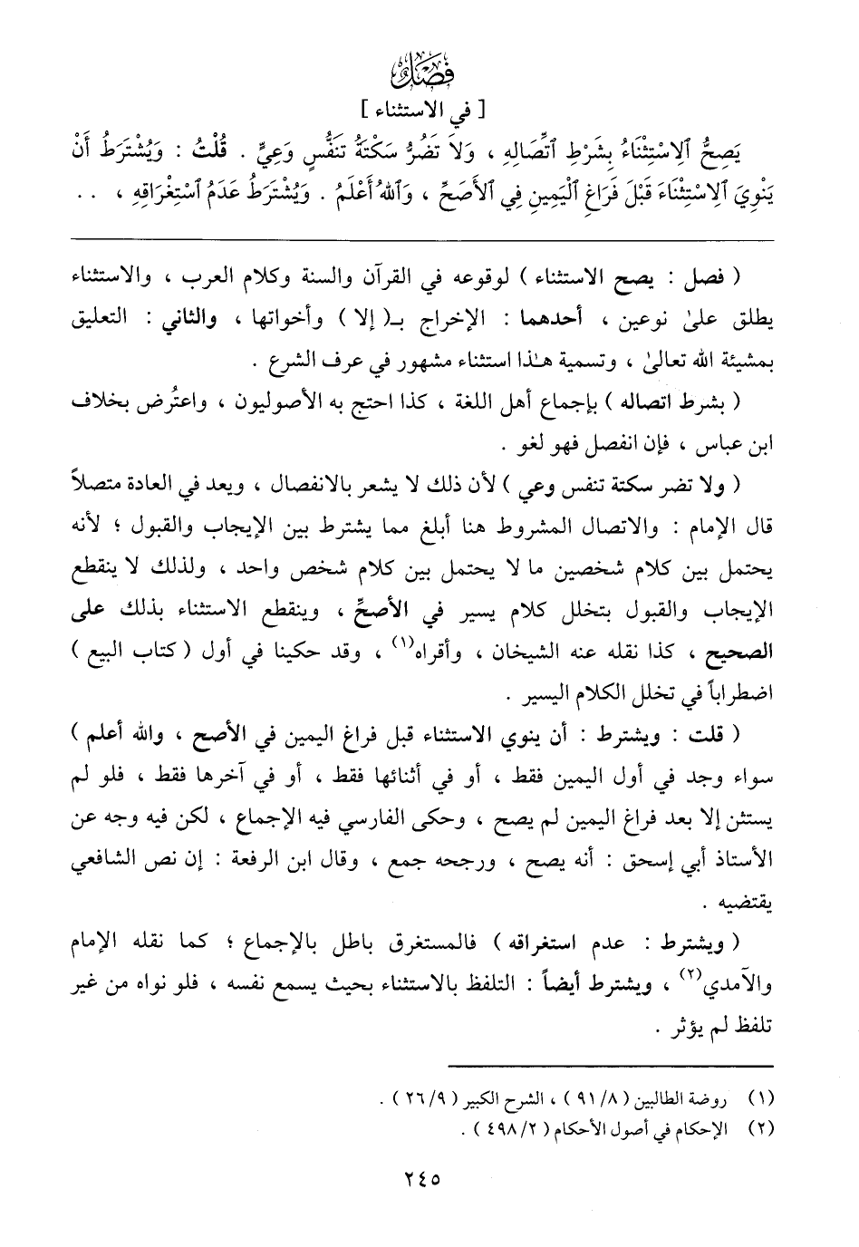 (ويشترط: عدم استغراقه) فالمستغرق باطل بالإجماع؛ كما نقله الإمام والآمدي (٢)، ويشترط أيضًا: التلفظ بالاستثناء بحيث يسمع نفسه، فلو نواه من غير تلفظ لم يؤثر.