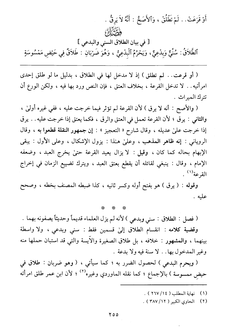 (ويحرم البدعي) لحصول الضرر به؛ كما سيأتي، (وهو ضربان: طلاق في حيضِ ممسوسة) بالإجماع؛ كما نقله الماوردي وغيره (٢)؛ لأن ابن عمر طلق امرأته