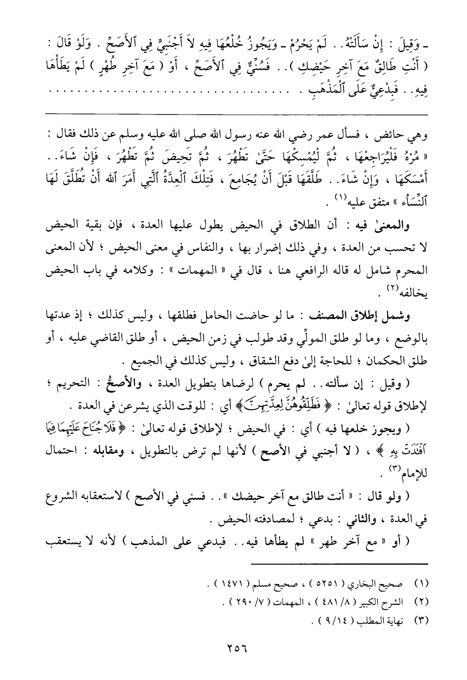 وهي حائض، فسأل عمر رضي الله عنه رسول الله صلى الله عليه وسلم عن ذلك فقال: "مُرْهُ فَلْيُرَاجِعْهَا، ثُمَّ لْيُمْسِكْهَا حَتَّى تَطْهُرَ، ثُمَّ تَحِيضَ ثُمَّ تَطْهُرَ، فَإِنْ شَاءَ .. أَمْسَكَهَا، وَإِنْ شَاءَ .. طَلَّقَهَا قَبْلَ أَنْ يُجَامِعَ، فَتِلْكَ الْعِدَّةُ الَّتِي أَمَرَ الله أَنْ تُطَلَّقَ لَهَا النِّسَاُء" متفق عليه (١).