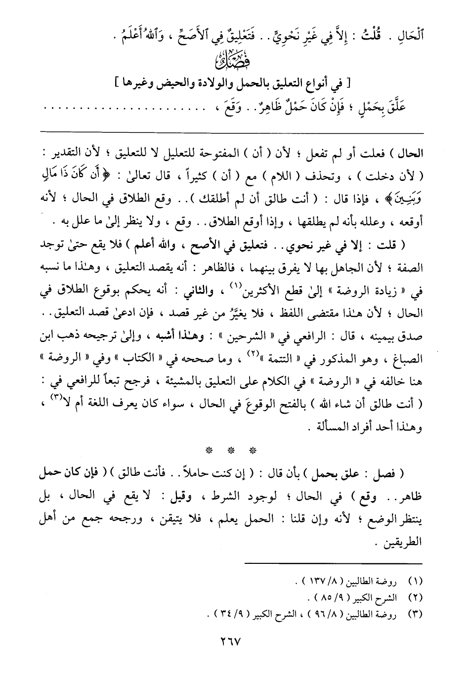 (قلت: إلا في غير نحوي .. فتعليق في الأصح، والله أعلم) فلا يقع حتى توجد الصفة؛ لأن الجاهل بها لا يفرق بينهما، فالظاهر: أنه يقصد التعليق، وهذا ما نسبه في "زيادة الروضة" إلى قطع الأكثرين (١)، والثاني: أنه يحكم بوقوع الطلاق في الحال؛ لأن هذا مقتضى اللفظ، فلا يغيَّرُ من غير قصد، فإن ادعى قصد التعليق .. صدق بيمينه، قال: الرافعي في "الشرحين": وهذا أشبه، وإلى ترجيحه ذهب ابن الصباغ، وهو المذكور في "التتمة" (٢)، وما صححه في "الكتاب" وفي "الروضة" هنا خالفه في "الروضة" في الكلام على التعليق بالمشيئة، فرجح تبعًا للرافعي في: (أنت طالق أن شاء الله) بالفتح الوقوعَ في الحال، سواء كان يعرف اللغة أم لا (٣)، وهذا أحد أفراد المسألة.