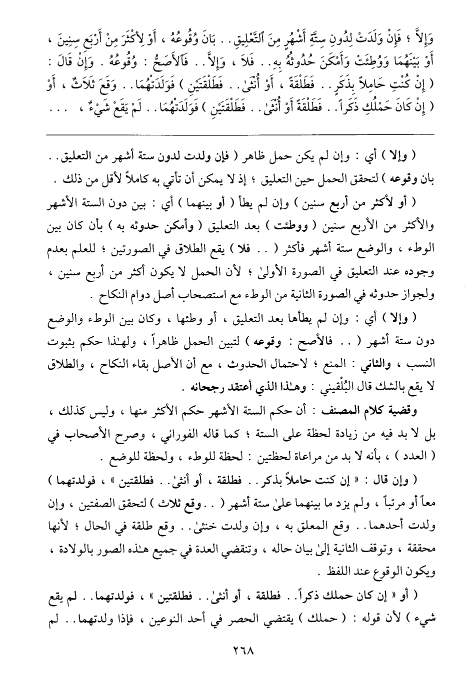(وإن قال: "إن كنت حاملًا بذكر .. فطلقة، أو أنثى .. فطلقتين"، فولدتهما) معًا أو مرتبًا، ولم يزد ما بينهما على ستة أشهر ( .. وقع ثلاث) لتحقق الصفتين، وإن ولدت أحدهما .. وقع المعلق به، وإن ولدت خنثى .. وقع طلقة في الحال؛ لأنها محققة، وتوقف الثانية إلى بيان حاله، وتنقضي العدة في جميع هذه الصور بالولادة، ويكون الوقوع عند اللفظ.
