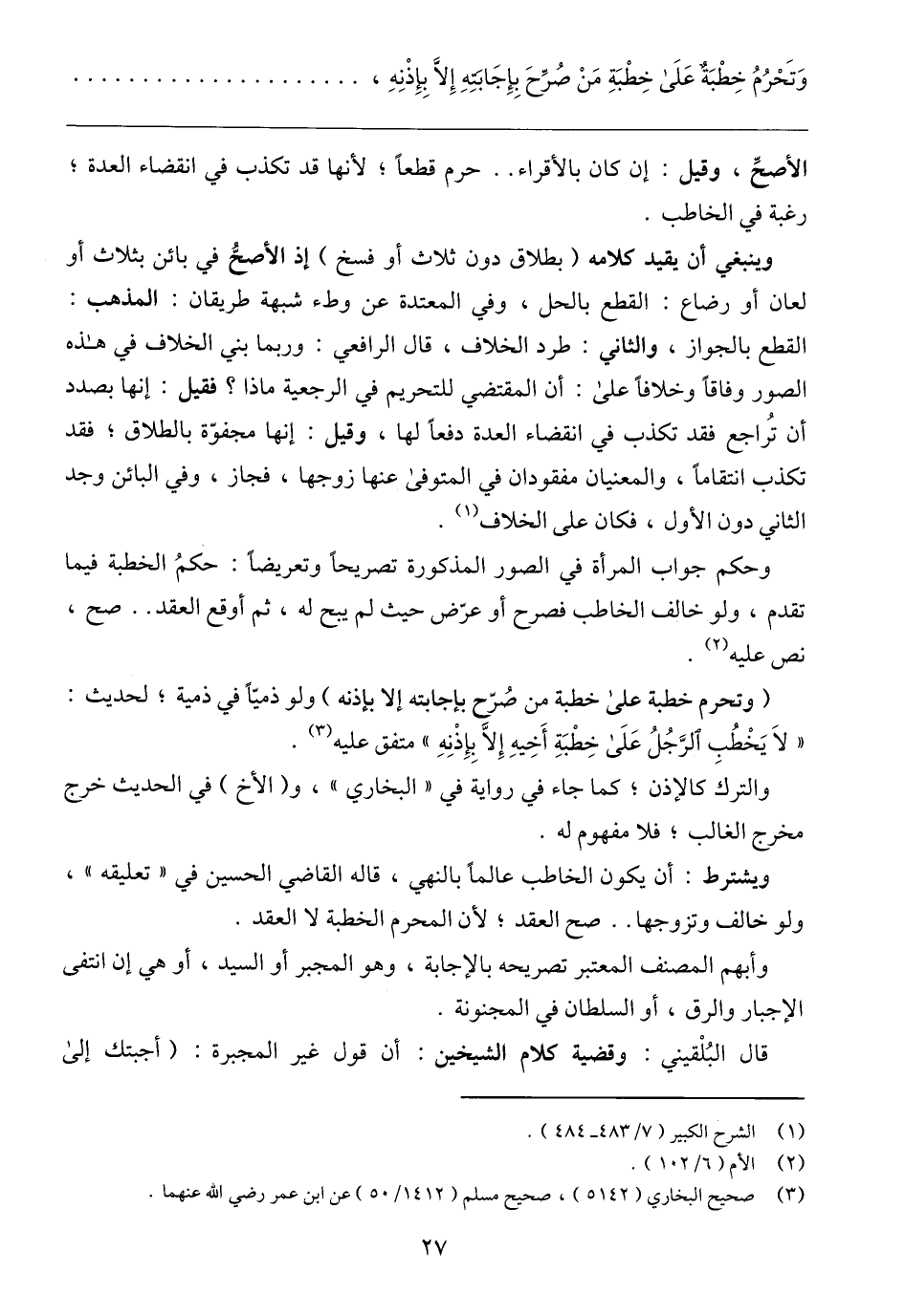 (وتحرم خطبة على خطبة من صُرّح بإجابته إلا بإذنه) ولو ذميًّا في ذمية؛ لحديث: "لَا يَخطُبِ الرَّجُلُ عَلَى خِطْبَةِ أَخِيهِ إِلَّا بِإِذْنِهِ" متفق عليه (٣).