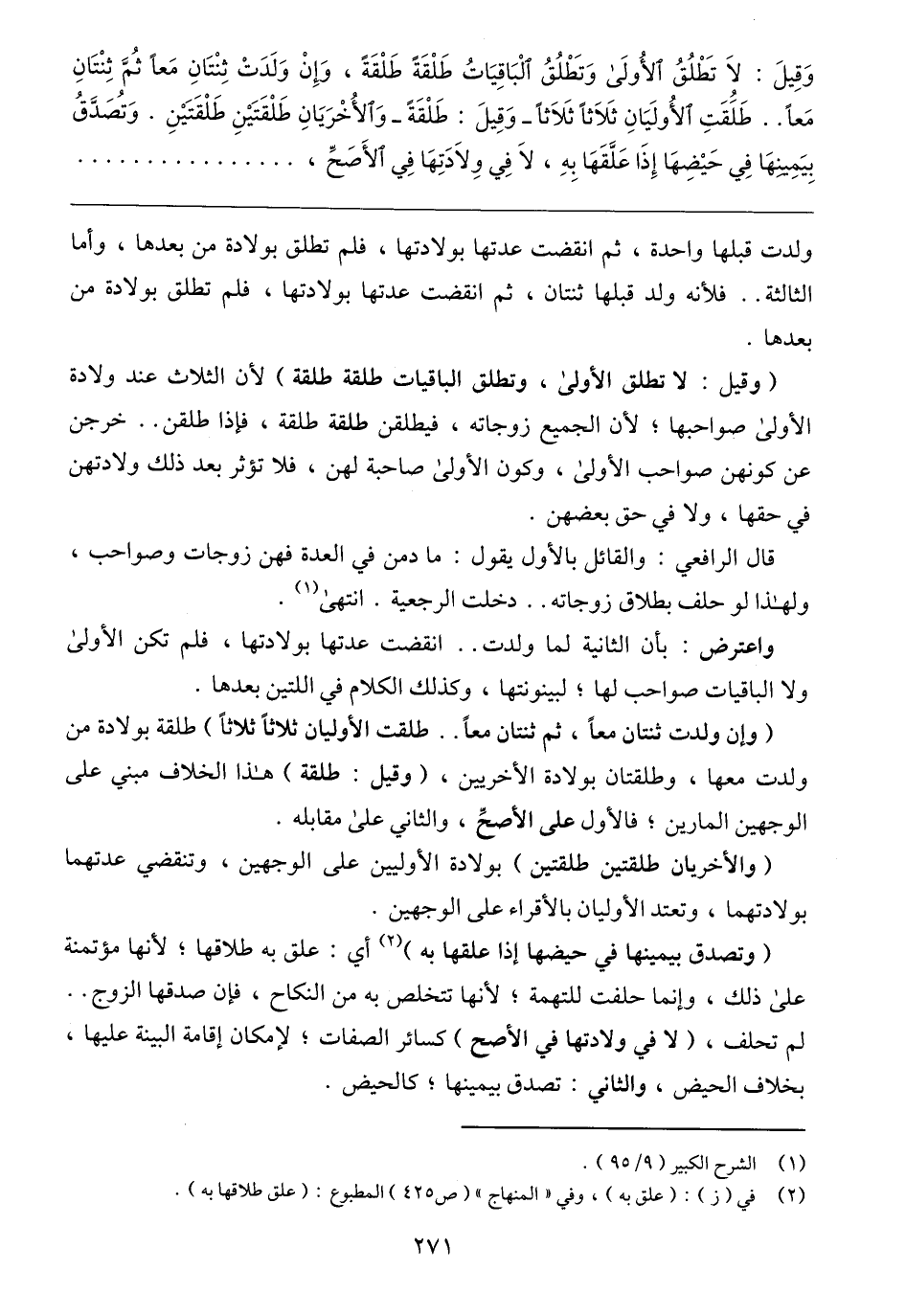 (وقيل: لا تطلق الأولى، وتطلق الباقيات طلقة طلقة) لأن الثلاث عند ولادة الأولى صواحبها؛ لأن الجميع زوجاته، فيطلقن طلقة طلقة، فإذا طلقن .. خرجن عن كونهن صواحب الأولى، وكون الأولى صاحبة لهن، فلا تؤثر بعد ذلك ولادتهن في حقها، ولا في حق بعضهن.