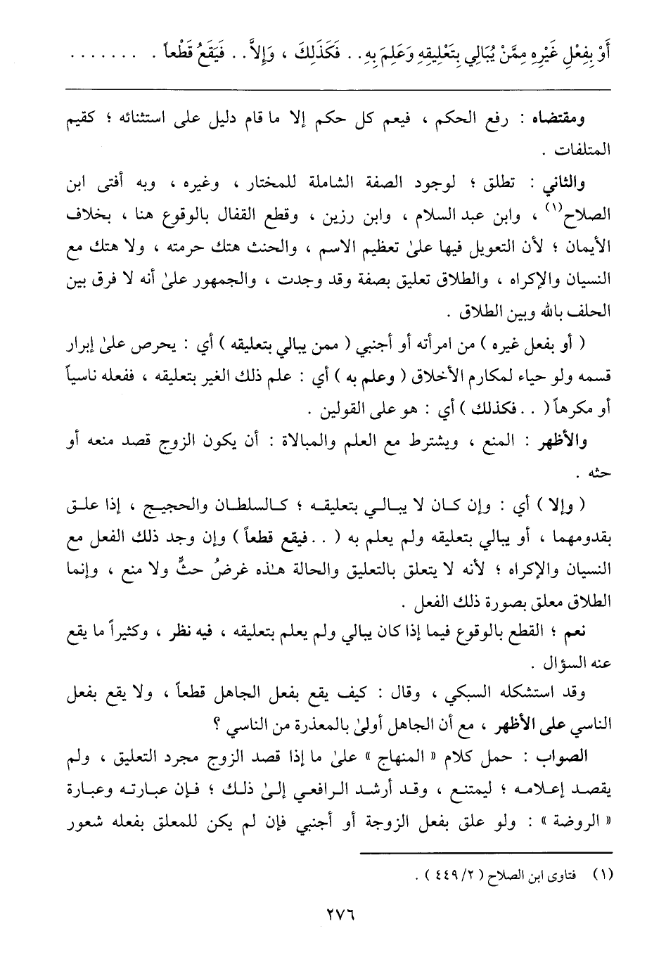 الصواب: حمل كلام "المنهاج" على ما إذا قصد الزوج مجرد التعليق، ولم يقصد إعلامه؛ ليمتنع، وقد أرشد الرافعي إلى ذلك؛ فإن عبارته وعبارة "الروضة": ولو علق بفعل الزوجة أو أجنبي فإن لم يكن للمعلق بفعله شعور