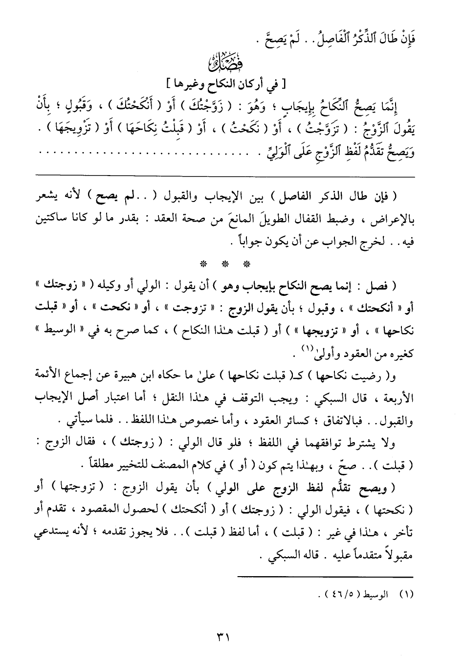 (ويصح تقدُّم لفظ الزوج على الولي) بأن يقول الزوج: (تزوجتها) أو (نكحتها)، فيقول الولي: (زوجتك) أو (أنكحتك) لحصول المقصود، تقدم أو تأخر، هذا في غير: (قبلت)، أما لفظ (قبلت) .. فلا يجوز تقدمه؛ لأنه يستدعي مقبولًا متقدمًا عليه. قاله السبكي.