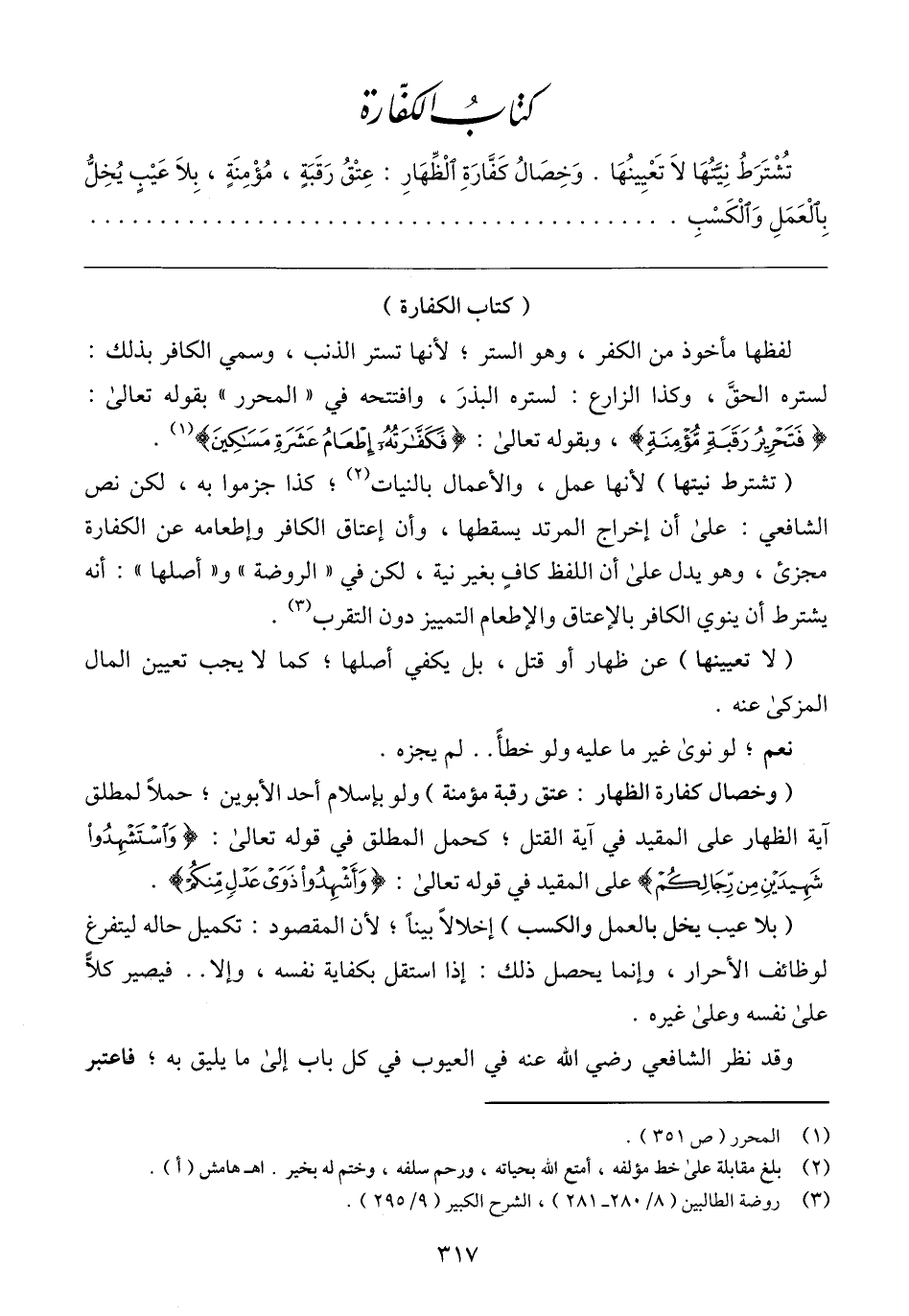 لفظها مأخوذ من الكفر، وهو الستر؛ لأنها تستر الذنب، وسمي الكافر بذلك: لستره الحقَّ، وكذا الزارع: لستره البذرَ، وافتتحه في "المحرر" بقوله تعالى: {فَتَحْرِيرُ رَقَبَةٍ مُؤْمِنَةٍ}، وبقوله تعالى: {فَكَفَّارَتُهُ إِطْعَامُ عَشَرَةِ مَسَاكِينَ} (١).