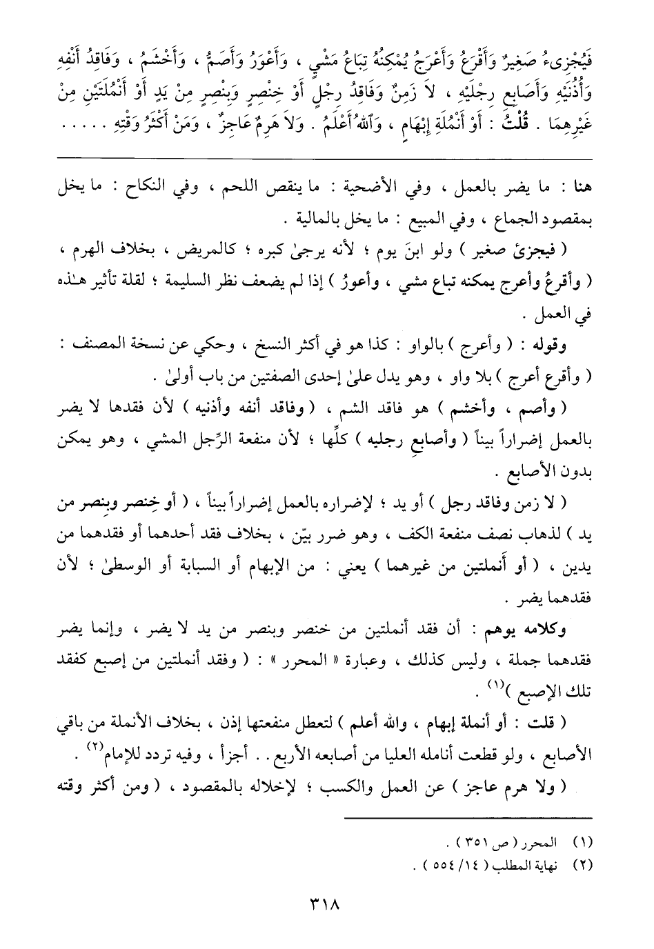 وكلامه يوهم: أن فقد أنملتين من خنصر وبنصر من يد لا يضر، وإنما يضر فقدهما جملة، وليس كذلك، وعبارة "المحرر": (وفقد أنملتين من إصبع كفقد تلك الإصبع) (١).