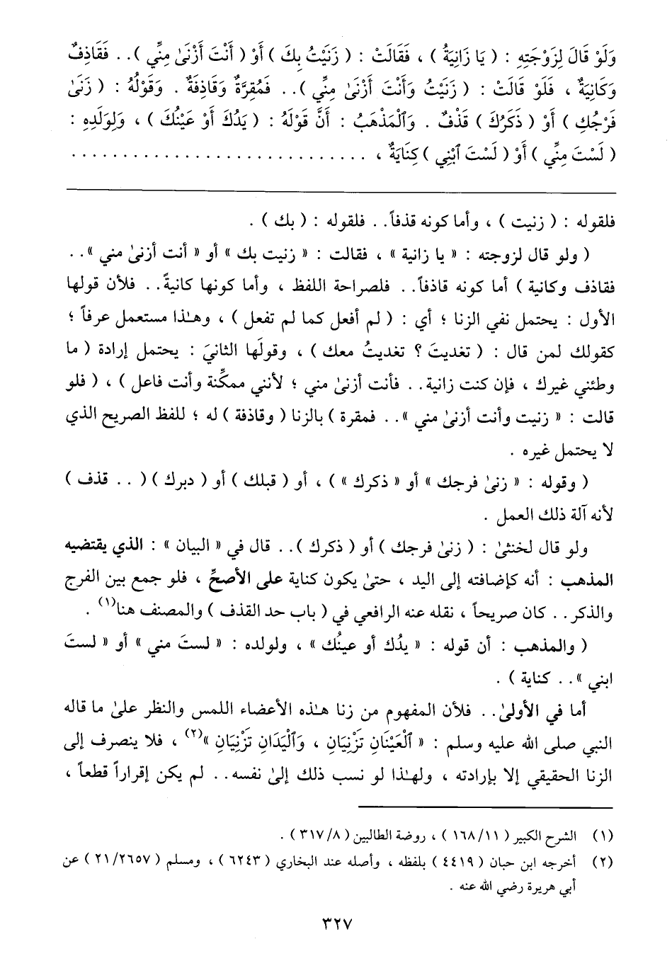أما في الأولى .. فلأن المفهوم من زنا هذه الأعضاء اللمس والنظر على ما قاله النبي -صلى الله عليه وسلم -: "الْعَيْنَانِ تَزْنِيَانِ، وَالْيَدَانِ تَزْنِيَانِ" (٢)، فلا ينصرف إلى الزنا الحقيقي إلا بإرادته، ولهذا لو نسب ذلك إلى نفسه .. لم يكن إقرارًا قطعًا،