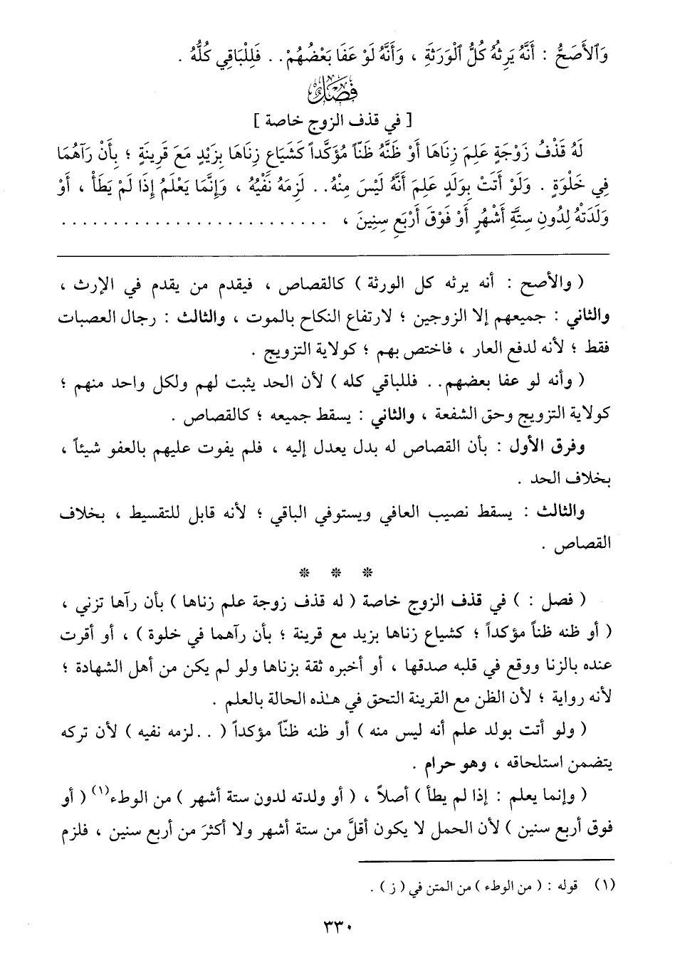 (فصل: ) في قذف الزوج خاصة (له قذف زوجة علم زناها) بأن رآها تزني، (أو ظنه ظنًّا مؤكدًا؛ كشياع زناها بزيد مع قرينة؛ بأن رآهما في خلوة)، أو أقرت عنده بالزنا ووقع في قلبه صدقها، أو أخبره ثقة بزناها ولو لم يكن من أهل الشهادة؛ لأنه رواية؛ لأن الظن مع القرينة التحق في هذه الحالة بالعلم.