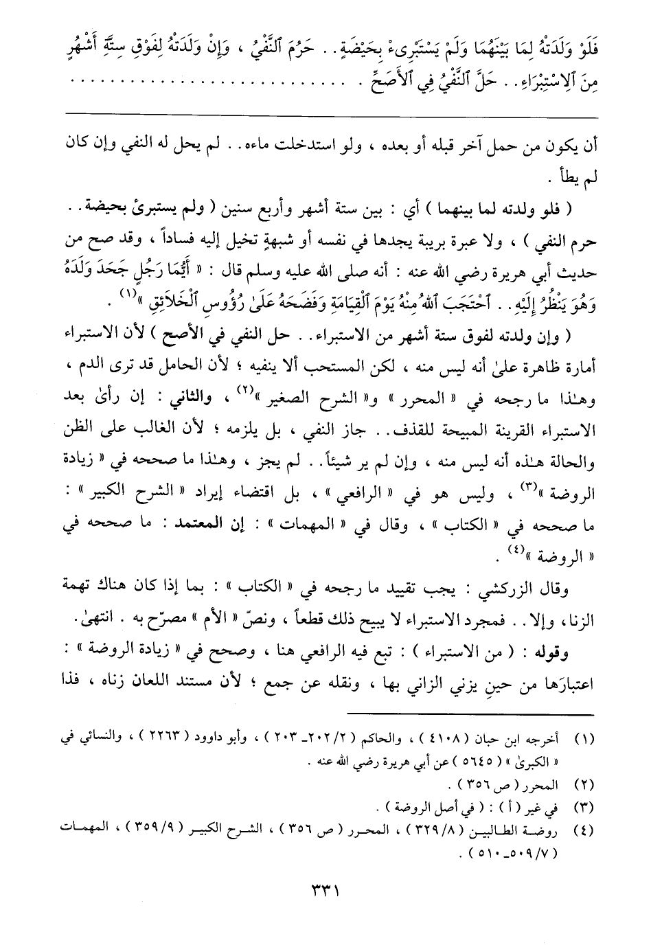 (فلو ولدته لما بينهما) أي: بين ستة أشهر وأربع سنين (ولم يستبرئ بحيضة .. حرم النفي)، ولا عبرة بريبة يجدها في نفسه أو شبهةٍ تخيل إليه فسادًا، وقد صح من حديث أبي هريرة -رضي الله عنه-: أنه -صلى الله عليه وسلم - قال: "أَيُّمَا رَجُلٍ جَحَدَ وَلَدَهُ وَهُوَ يَنْظُرُ إِلَيْهِ .. احْتَجَبَ اللهُ مِنْهُ يَوْمَ الْقِيَامَةِ وَفَضَحَهُ عَلَى رُؤُوسِ الْخلائِقِ" (١).