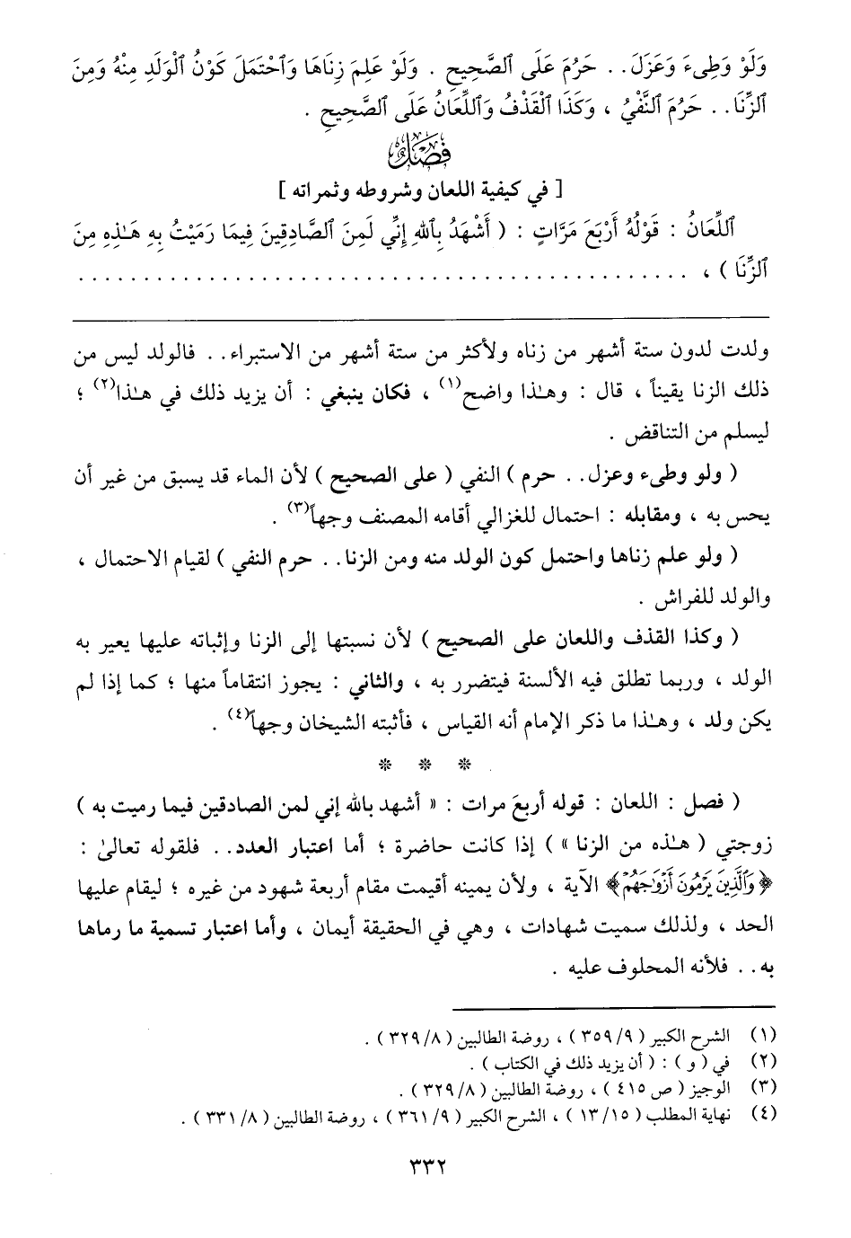 (فصل: اللعان: قوله أربعَ مرات: "أشهد بالله إني لمن الصادقين فيما رميت به) زوجتي (هذه من الزنا") إذا كانت حاضرة؛ أما اعتبار العدد .. فلقوله تعالى: {وَالَّذِينَ يَرْمُونَ أَزْوَاجَهُمْ} [النور: ٦]، ولأن يمينه أقيمت مقام أربعة شهود من غيره؛ ليقام عليها الحد، ولذلك سميت شهادات، وهي في الحقيقة أيمان، وأما اعتبار تسمية ما رماها به .. فلأنه المحلوف عليه.