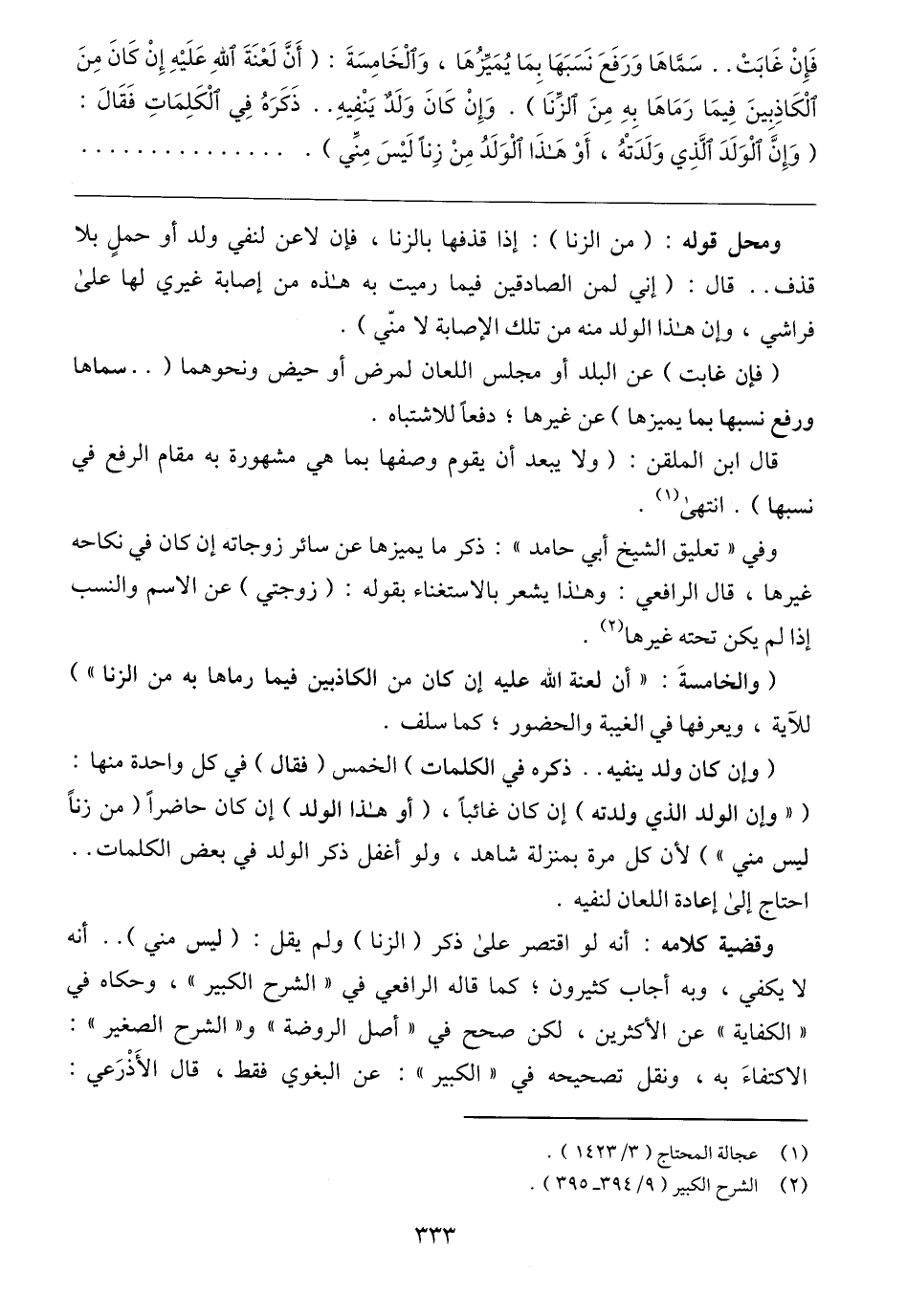 وقضية كلامه: أنه لو اقتصر على ذكر (الزنا) ولم يقل: (ليس مني) .. أنه لا يكفي، وبه أجاب كثيرون، كما قاله الرافعي في "الشرح الكبير"، وحكاه في "الكفاية" عن الأكثرين، لكن صحح في "أصل الروضة" و"الشرح الصغير": الاكتفاءَ به، ونقل تصحيحه في "الكبير": عن البغوي فقط، قال الأَذْرَعي: