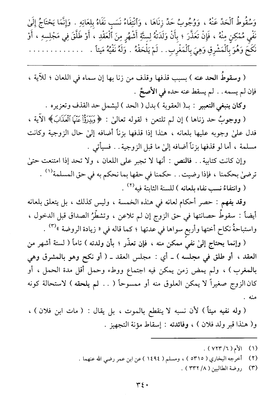 (ووجوبُ حد زناها) إن لم تلتعن؛ لقوله تعالى: {وَيَدْرَأُ عَنْهَا الْعَذَابَ} [النور: ٨]، فدل على وجوبه عليها بلعانه، هذا إذا قذفها بزنًا أضافه إلى حال الزوجية وكانت مسلمة، أما لو قذفها بزنًا أضافه إلى ما قبل الزوجية .. فسيأتي.