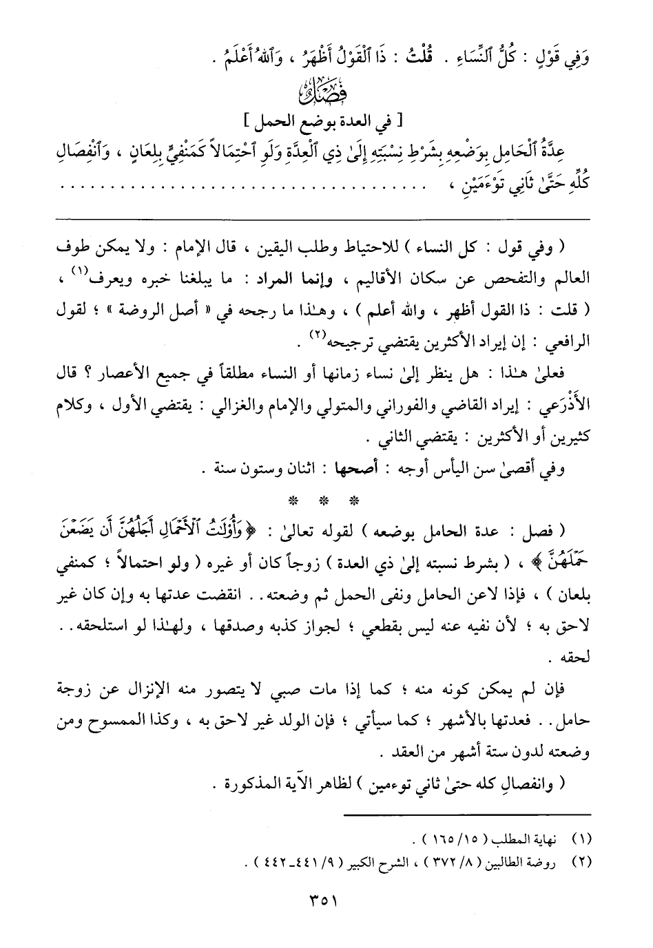 (فصل: عدة الحامل بوضعه) لقوله تعالى: {وَأُولَاتُ الْأَحْمَالِ أَجَلُهُنَّ أَنْ يَضَعْنَ حَمْلَهُنَّ}، (بشرط نسبته إلى ذي العدة) زوجًا كان أو غيره (ولو احتمالًا؛ كمنفي بلعان)، فإذا لاعن الحامل ونفى الحمل ثم وضعته .. انقضت عدتها به وإن كان غير لاحق به؛ لأن نفيه عنه ليس بقطعي؛ لجواز كذبه وصدقها، ولهذا لو استلحقه .. لحقه.
