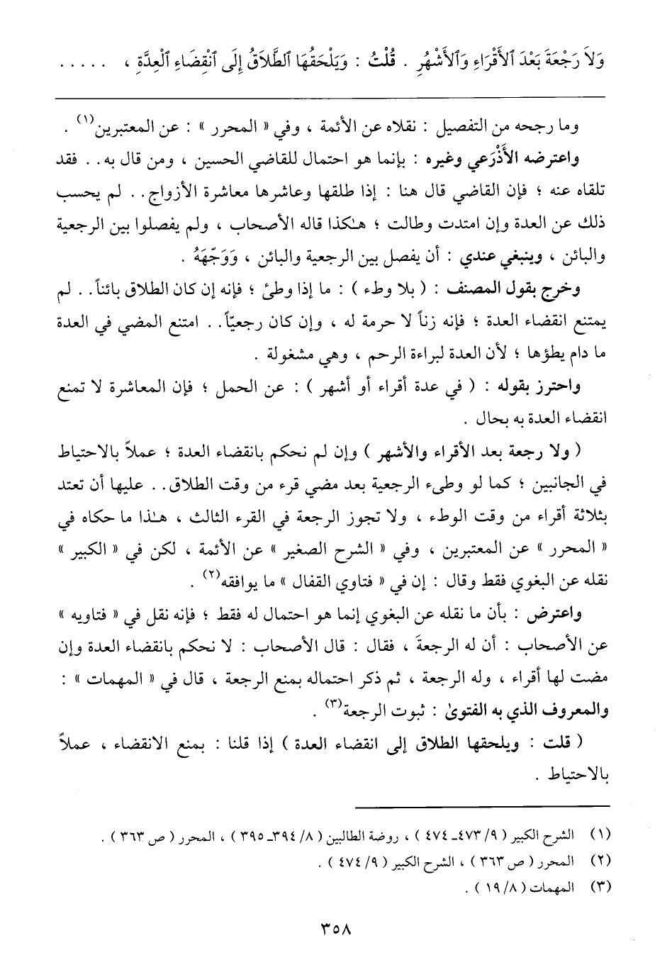 (ولا رجعة بعد الأقراء والأشهر) وإن لم نحكم بانقضاء العدة؛ عملًا بالاحتياط في الجانبين؛ كما لو وطئ الرجعية بعد مضي قرء من وقت الطلاق .. عليها أن تعتد بثلاثة أقراء من وقت الوطء، ولا تجوز الرجعة في القرء الثالث، هذا ما حكاه في "المحرر" عن المعتبرين، وفي "الشرح الصغير" عن الأئمة، لكن في "الكبير" نقله عن البغوي فقط وقال: إن في "فتاوي القفال" ما يوافقه (٢).