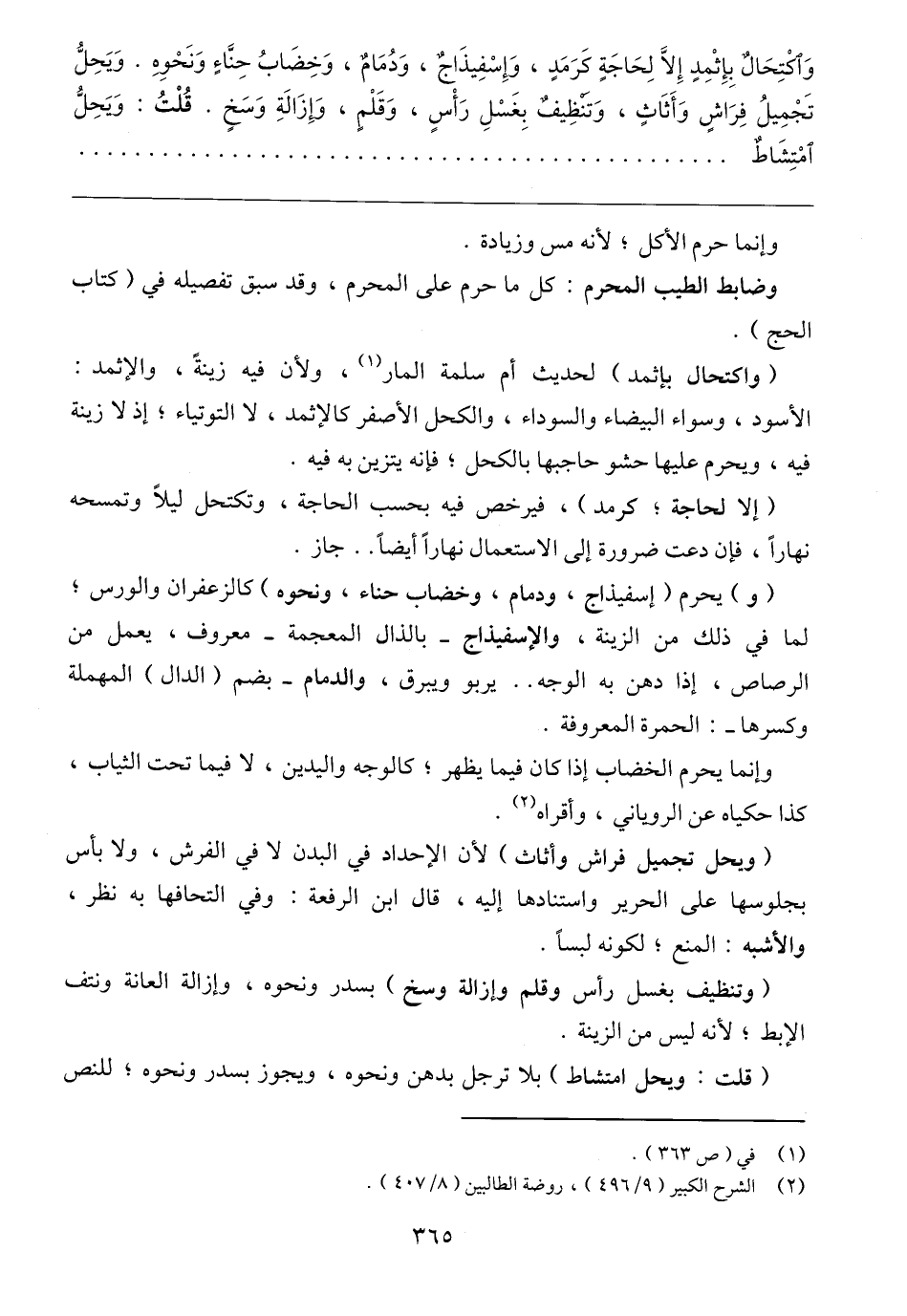 (و) يحرم (إسفيذاج، ودمام، وخضاب حناء، ونحوه) كالزعفران والورس؛ لما في ذلك من الزينة، والإسفيذاج -بالذال المعجمة- معروف، يعمل من الرصاص، إذا دهن به الوجه .. يربو ويبرق، والدمام -بضم (الدال) المهملة وكسرها-: الحمرة المعروفة.