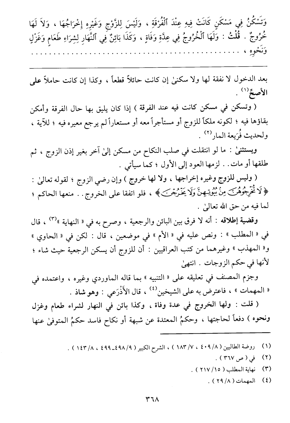 (قلت: ولها الخروج في عدة وفاة، وكذا بائن في النهار لشراء طعام وغزل ونحوه) دفعًا لحاجتها، وحكمُ المعتدة عن شبهة أو نكاح فاسد حكمُ المتوفى عنها