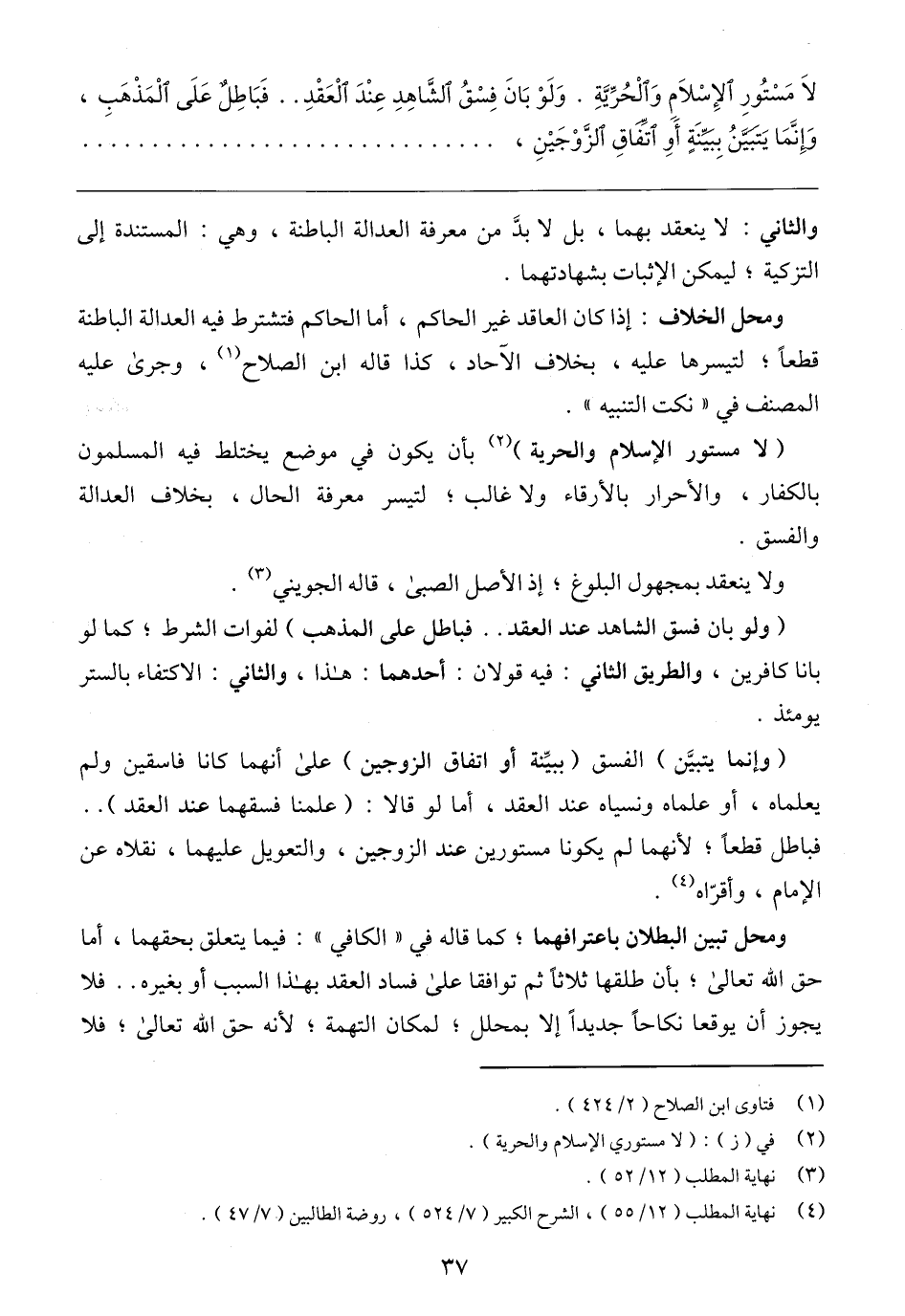 ومحل الخلاف: إذا كان العاقد غير الحاكم، أما الحاكم فتشترط فيه العدالة الباطنة قطعًا؛ لتيسرها عليه، بخلاف الآحاد، كذا قاله ابن الصلاح (١)، وجرى عليه المصنف في "نكت التنبيه".
