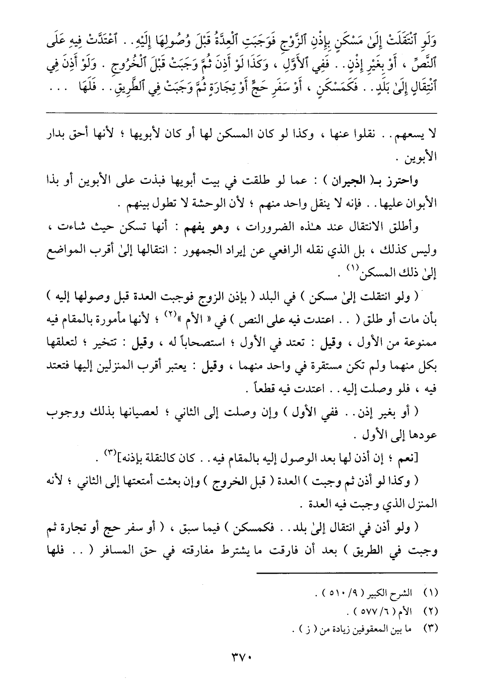 وأطلق الانتقال عند هذه الضرورات، وهو يفهم: أنها تسكن حيث شاءت، وليس كذلك، بل الذي نقله الرافعي عن إيراد الجمهور: انتقالها إلى أقرب المواضع إلى ذلك المسكن (١).
