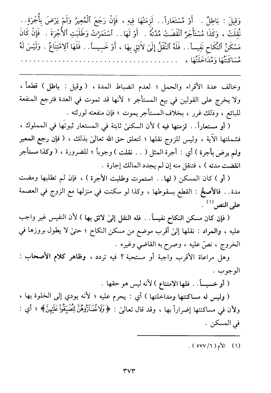 (أو مستعارًا .. لزمتها فيه) لأن السكنى ثابتة في المستعار ثبوتَها في المملوك، فشملتها الآية، وليس للزوج نقلها؛ لتعلق حق اللَّه تعالى بذلك، (فإن رجع المعير ولم يرض بأجرة (أي: أجرة المثل ( .. نقلت) وجوبًا؛ للضرورة، (وكذا مستأجر انقضت مدته)، فتنقل منه إن لم يجدد المالك إجارة.