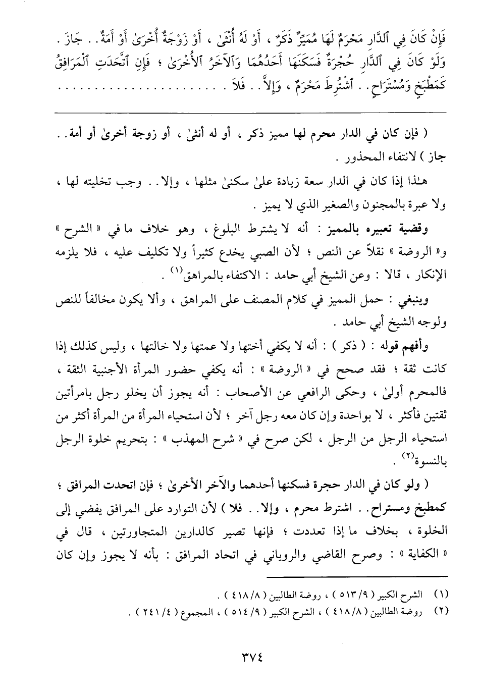 (ولو كان في الدار حجرة فسكنها أحدهما والآخر الأخرى، فإن اتحدت المرافق، كمطبخ ومستراح .. اشترط محرم، وإلا .. فلا) لأن التوارد على المرافق يفضي إلى الخلوة، بخلاف ما إذا تعددت، فإنها تصير كالدارين المتجاورتين، قال في "الكفاية": وصرح القاضي والروياني في اتحاد المرافق: بأنه لا يجوز وإن كان