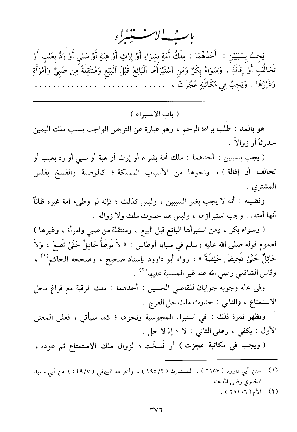 (يجب بسببين: أحدهما: ملك أمة بشراء أو إرث أو هبة أو سبي أو رد بعيب أو تحالف أو إقالة)، ونحوها من الأسباب المملكة؛ كالوصية والفسخ بفلس المشتري.