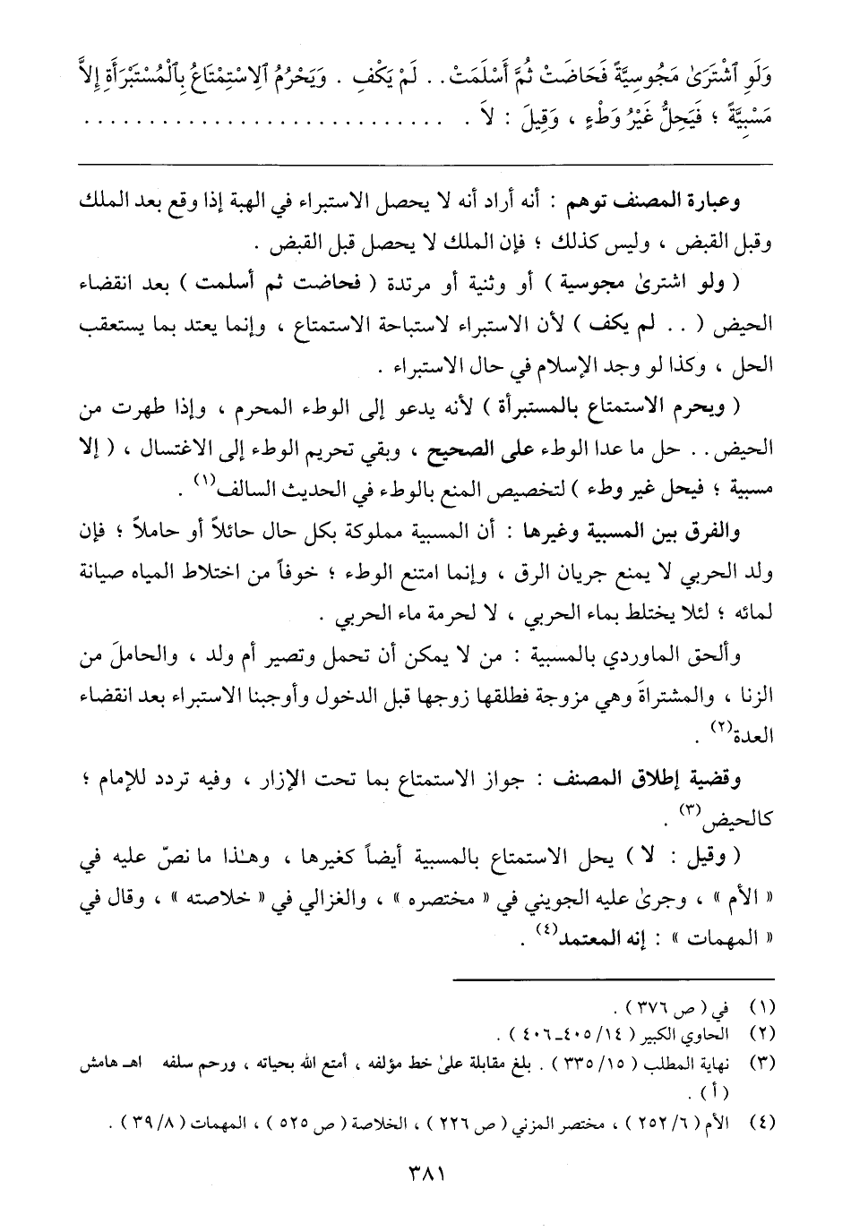 (ولو اشترى مجوسية) أو وثنية أو مرتدة (فحاضت ثم أسلمت) بعد انقضاء الحيض ( .. لم يكف) لأن الاستبراء لاستباحة الاستمتاع، وإنما يعتد بما يستعقب الحل، وكذا لو وجد الإسلام في حال الاستبراء.