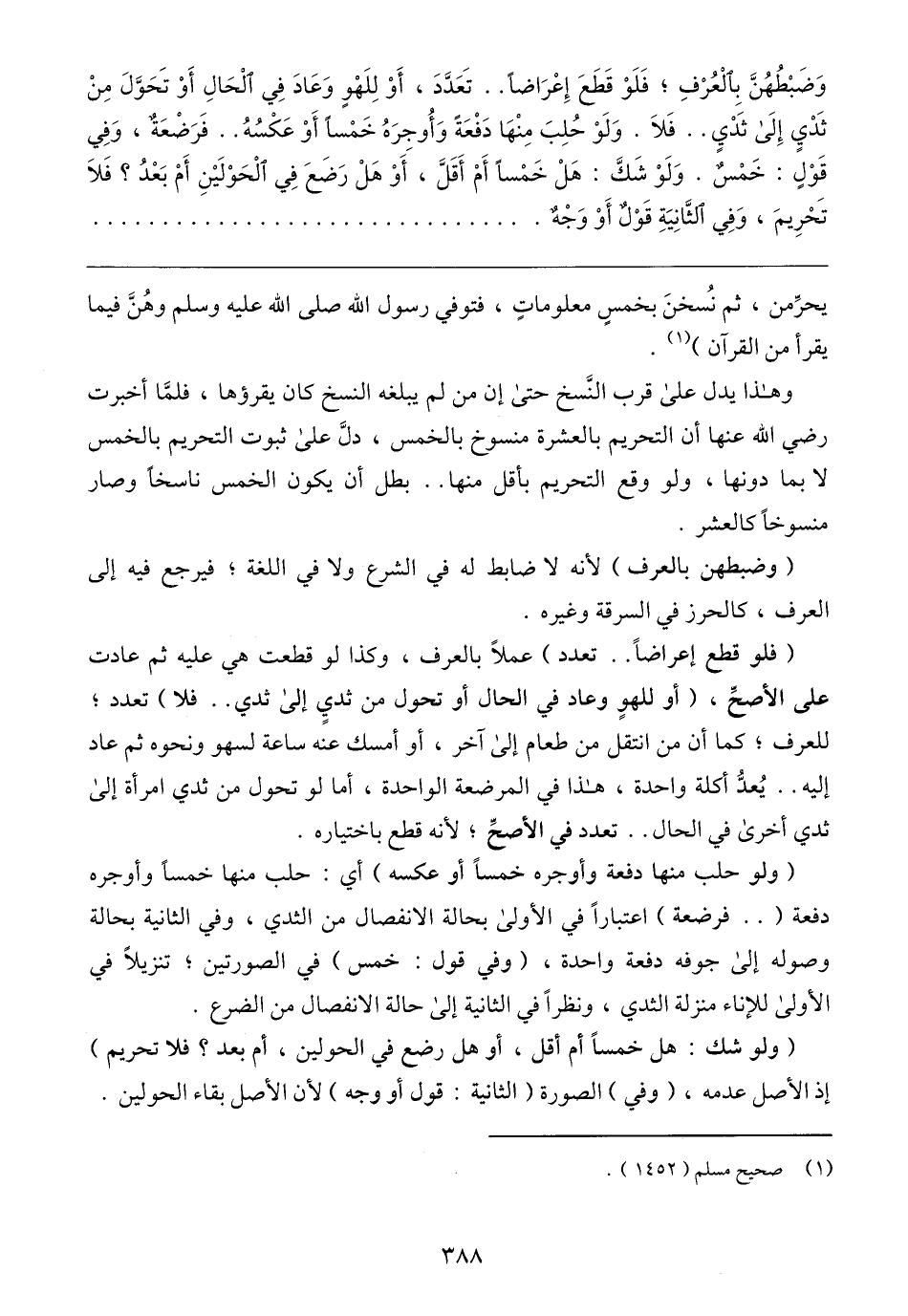وهذا يدل على قرب النَّسخ حتى إن من لم يبلغه النسخ كان يقرؤها، فلمَّا أخبرت رضي الله عنها أن التحريم بالعشرة منسوخ بالخمس، دلَّ على ثبوت التحريم بالخمس لا بما دونها، ولو وقع التحريم بأقل منها .. بطل أن يكون الخمس ناسخًا وصار منسوخًا كالعشر.