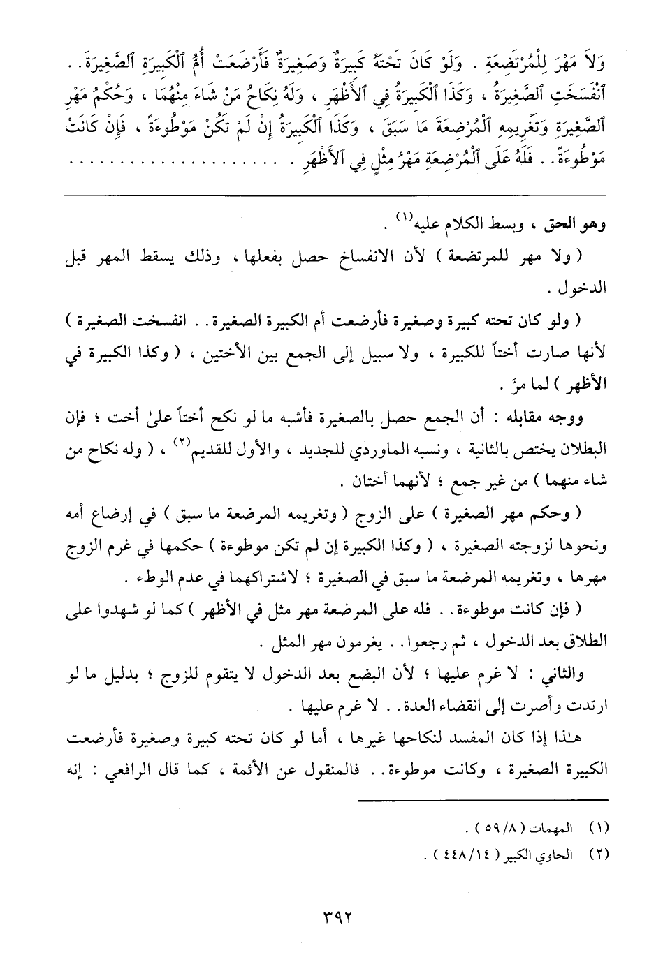 هذا إذا كان المفسد لنكاحها غيرها، أما لو كان تحته كبيرة وصغيرة فأرضعت الكبيرة الصغيرة، وكانت موطوءة .. فالمنقول عن الأئمة، كما قال الرافعي: إنه
