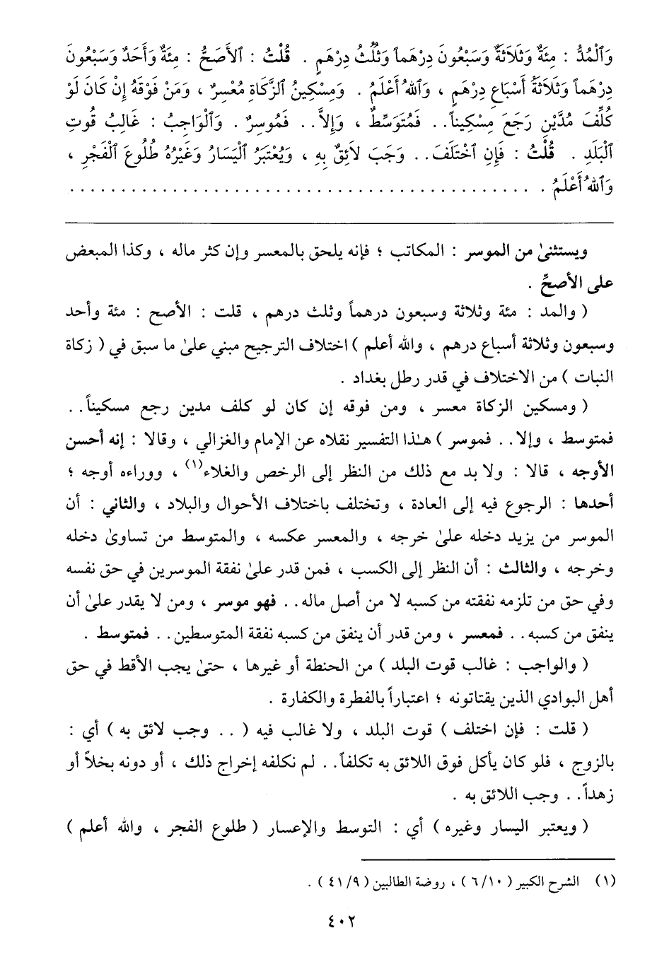 (ومسكين الزكاة معسر، ومن فوقه إن كان لو كلف مدين رجع مسكينًا .. فمتوسط، وإلا .. فموسر) هذا التفسير نقلاه عن الإمام والغزالي، وقالا: إنه أحسن الأوجه، قالا: ولا بد مع ذلك من النظر إلى الرخص والغلاء (١)، ووراءه أوجه؛ أحدها: الرجوع فيه إلى العادة، وتختلف باختلاف الأحوال والبلاد، والثاني: أن الموسر من يزيد دخله على خرجه، والمعسر عكسه، والمتوسط من تساوى دخله وخرجه، والثالث: أن النظر إلى الكسب، فمن قدر على نفقة الموسرين في حق نفسه وفي حق من تلزمه نفقته من كسبه لا من أصل ماله .. فهو موسر، ومن لا يقدر على أن ينفق من كسبه .. فمعسر، ومن قدر أن ينفق من كسبه نفقة المتوسطين .. فمتوسط.