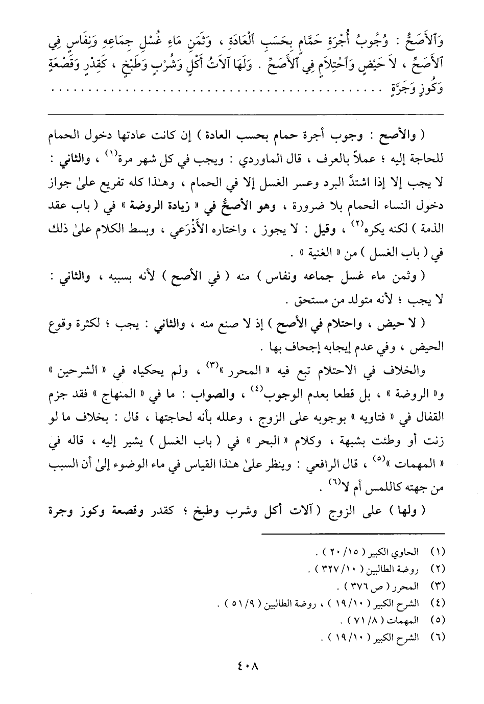 (والأصح: وجوب أجرة حمام بحسب العادة) إن كانت عادتها دخول الحمام للحاجة إليه؛ عملًا بالعرف، قال الماوردي: ويجب في كل شهر مرة (١)، والثاني: لا يجب إلا إذا اشتدَّ البرد وعسر الغسل إلا في الحمام، وهذا كله تفريع على جواز دخول النساء الحمام بلا ضرورة، وهو الأصحُّ في "زيادة الروضة" في (باب عقد الذمة) لكنه يكره (٢)، وقيل: لا يجوز، واختاره الأَذْرَعي، وبسط الكلام على ذلك في (باب الغسل) من "الغنية".