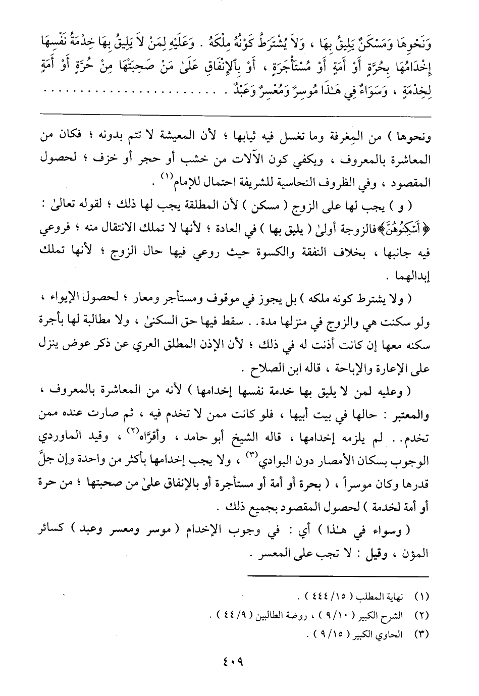 (وعليه لمن لا يليق بها خدمة نفسها إخدامها) لأنه من المعاشرة بالمعروف، والمعتبر: حالها في بيت أبيها، فلو كانت ممن لا تخدم فيه، ثم صارت عنده ممن تخدم .. لم يلزمه إخدامها، قاله الشيخ أبو حامد، وأقرَّاه (٢)، وقيد الماوردي الوجوب بسكان الأمصار دون البوادي (٣)، ولا يجب إخدامها بأكثر من واحدة وإن جلَّ قدرها وكان موسرًا، (بحرة أو أمة أو مستأجرة أو بالإنفاق على من صحبتها؛ من حرة أو أمة لخدمة) لحصول المقصود بجميع ذلك.