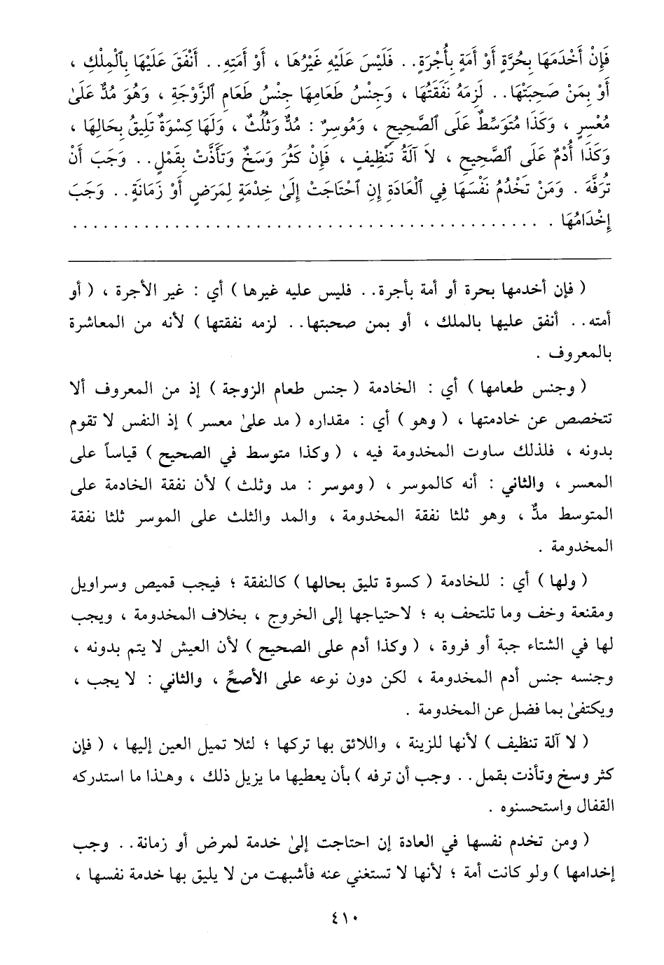 (ولها) أي: للخادمة (كسوة تليق بحالها) كالنفقة؛ فيجب قميص وسراويل ومقنعة وخف وما تلتحف به؛ لاحتياجها إلى الخروج، بخلاف المخدومة، ويجب لها في الشتاء جبة أو فروة، (وكذا أدم على الصحيح) لأن العيش لا يتم بدونه، وجنسه جنس أدم المخدومة، لكن دون نوعه على الأصحِّ، والثاني: لا يجب، ويكتفى بما فضل عن المخدومة.