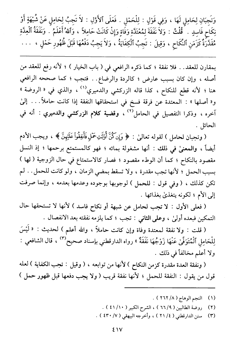 (قلت: ولا نفقة لمعتدة وفاة وإن كانت حاملًا، والله أعلم) لحديث: "لَيْسَ لِلْحَامِلِ الْمُتَوَفَّى عَنْهَا زَوْجُهَا نَفَقَةٌ" رواه الدارقطني بإسناد صحيح (٣)، قال الشافعي: ولا أعلم مخالفًا في ذلك.