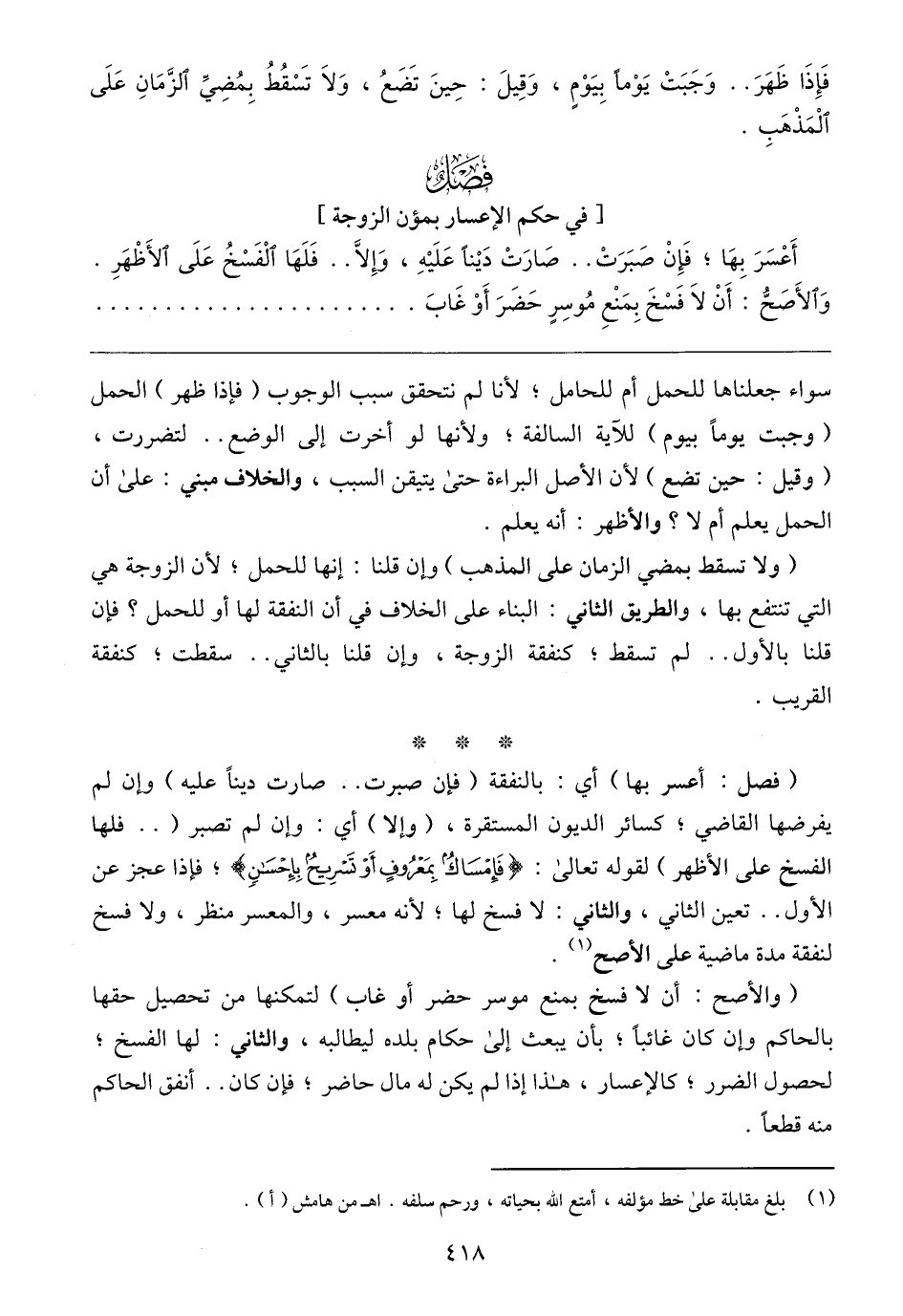 (فصل: أعسر بها) أي: بالنفقة (فإن صبرت .. صارت دينًا عليه) وإن لم يفرضها القاضي؛ كسائر الديون المستقرة، (وإلا) أي: وإن لم تصبر ( .. فلها الفسخ على الأظهر) لقوله تعالى: {فَإِمْسَاكٌ بِمَعْرُوفٍ أَوْ تَسْرِيحٌ بِإِحْسَانٍ}؛ فإذا عجز عن الأول .. تعين الثاني، والثاني: لا فسخ لها؛ لأنه معسر، والمعسر منظر، ولا فسخ لنفقة مدة ماضية على الأصح (١).