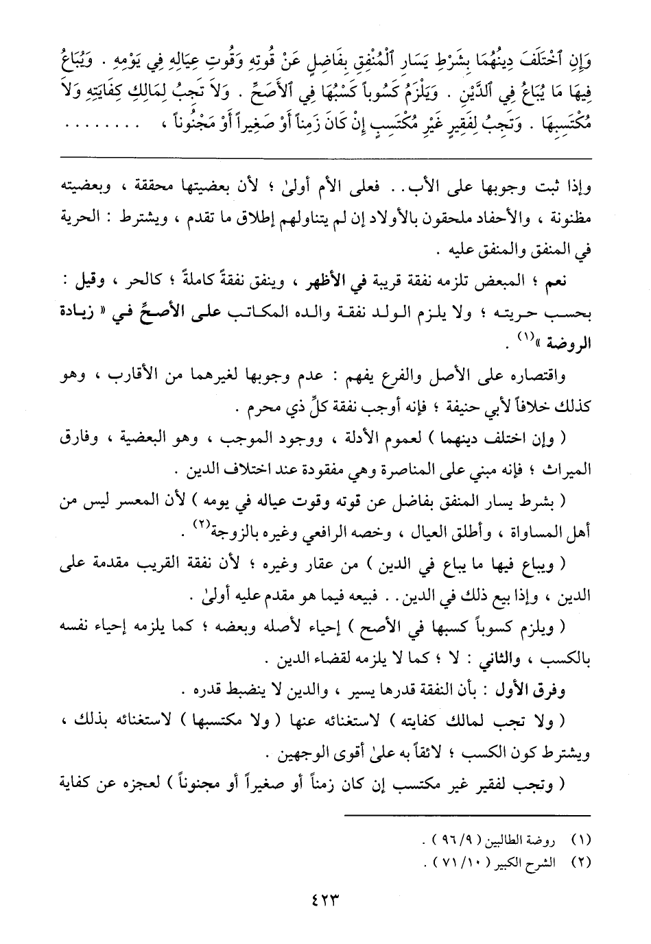 واقتصاره على الأصل والفرع يفهم: عدم وجوبها لغيرهما من الأقارب، وهو كذلك خلافًا لأبي حنيفة؛ فإنه أوجب نفقة كلِّ ذي محرم.