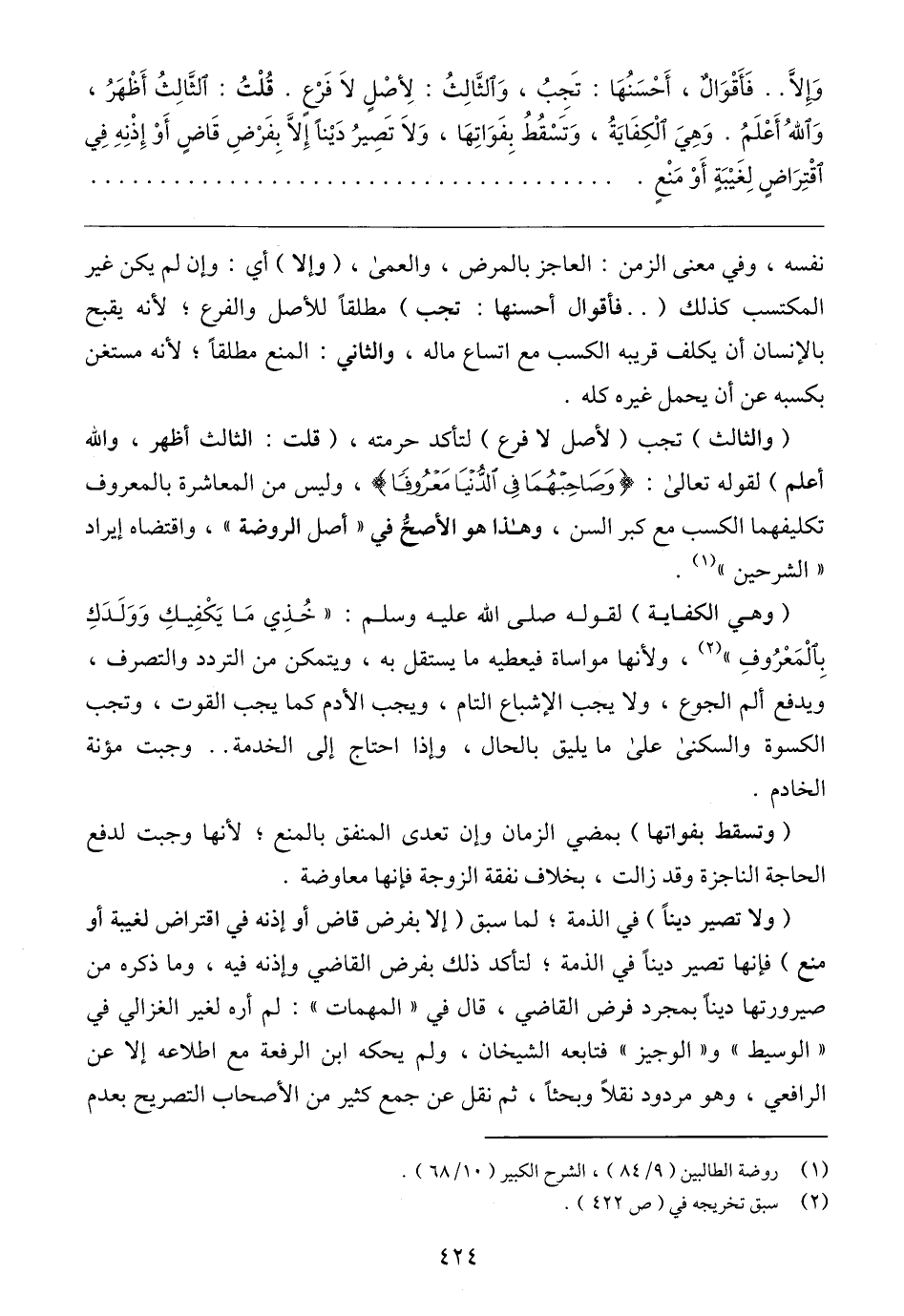 (والثالث) تجب (لأصل لا فرع) لتأكد حرمته، (قلت: الثالث أظهر، والله أعلم) لقوله تعالى: {وَصَاحِبْهُمَا فِي الدُّنْيَا مَعْرُوفًا} وليس من المعاشرة بالمعروف تكليفهما الكسب مع كبر السن، وهذا هو الأصحُّ في "أصل الروضة"، واقتضاه إيراد "الشرحين" (١).