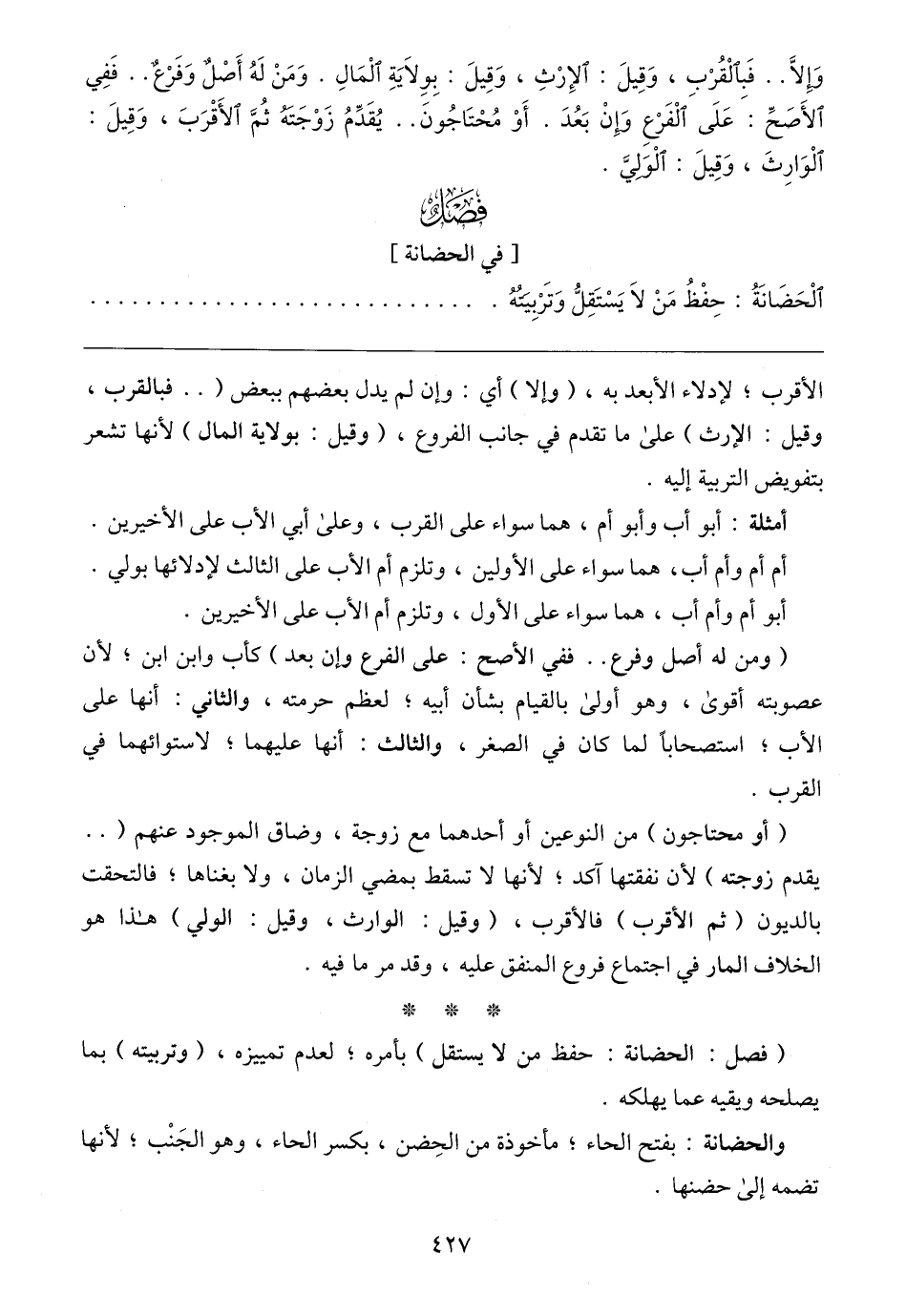 (فصل: الحضانة: حفظ من لا يستقل) بأمره؛ لعدم تمييزه، (وتربيته) بما يصلحه ويقيه عما يهلكه.