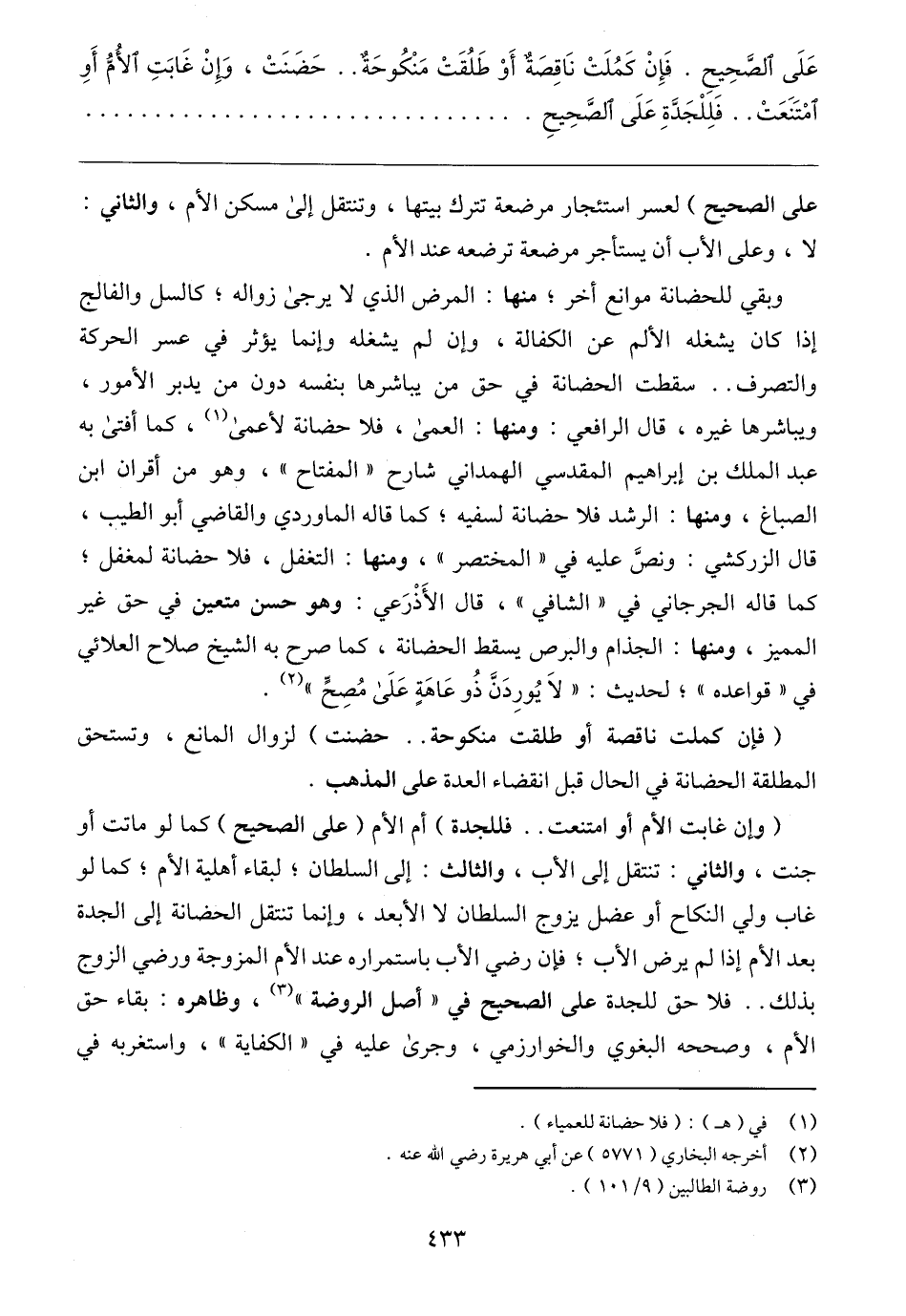 وبقي للحضانة موانع آخر؛ منها: المرض الذي لا يرجى زواله؛ كالسل والفالج إذا كان يشغله الألم عن الكفالة، وإن لم يشغله وإنما يؤثر في عسر الحركة والتصرف. . سقطت الحضانة في حق من يباشرها بنفسه دون من يدبر الأمور، ويباشرها غيره، قال الرافعي: ومنها: العمى، فلا حضانة لأعمى (١)، كما أفتى به عبد الملك بن إبراهيم المقدسي الهمداني شارح "المفتاح"، وهو من أقران ابن الصباغ، ومنها: الرشد فلا حضانة لسفيه؛ كما قاله الماوردي والقاضي أبو الطيب، قال الزركشي: ونصَّ عليه في "المختصر"، ومنها: التغفل، فلا حضانة لمغفل؛ كما قاله الجرجاني في "الشافي"، قال الأَذْرَعي: وهو حسن متعين في حق غير المميز، ومنها: الجذام والبرص يسقط الحضانة، كما صرح به الشيخ صلاح العلائي في "قواعده"؛ لحديث: "لَا يُورِدَنَّ ذُو عَاهَةٍ عَلَى مُصِحٍّ" (٢).