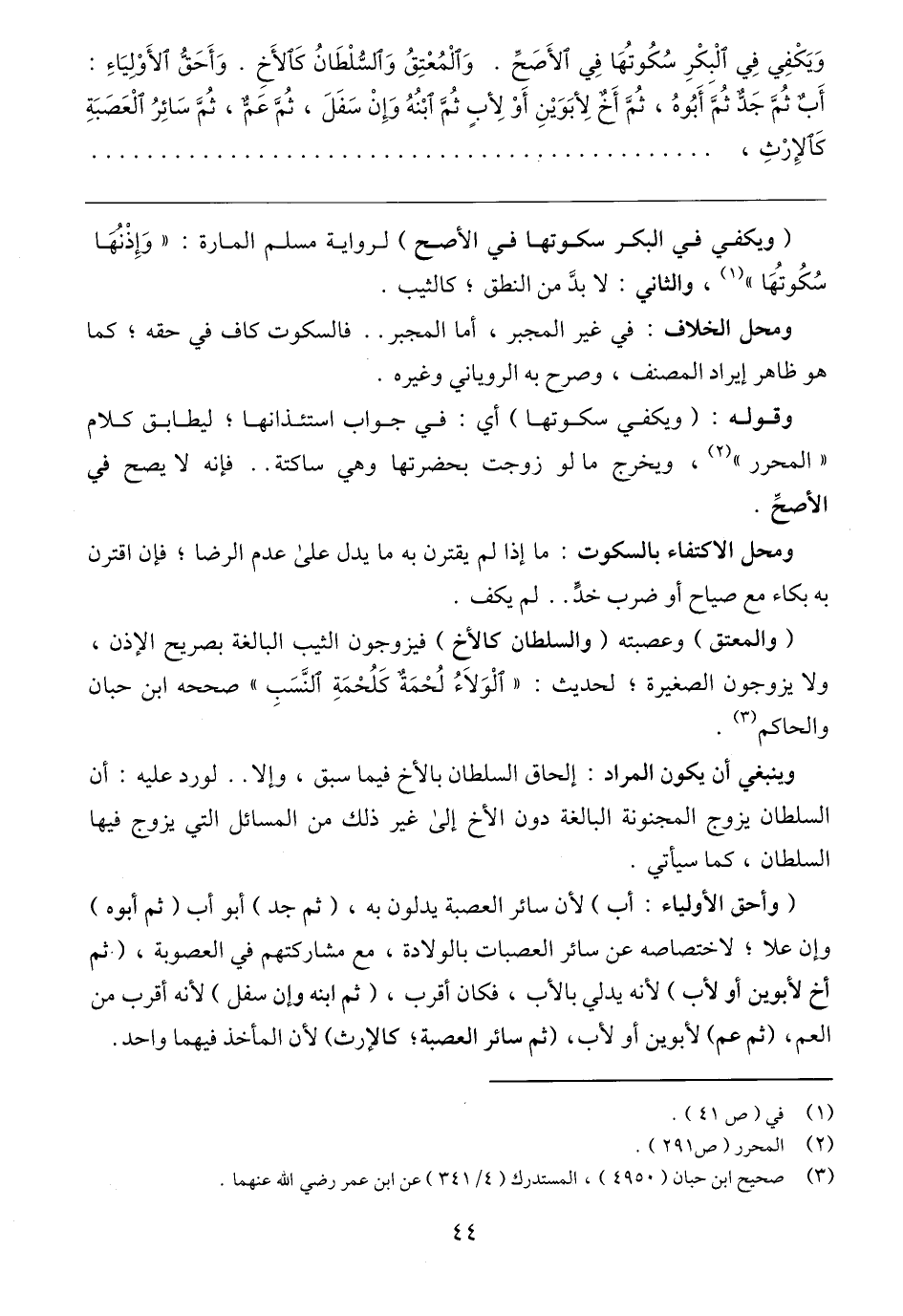(والمعتق) وعصبته (والسلطان كالأخ) فيزوجون الثيب البالغة بصريح الإذن، ولا يزوجون الصغيرة؛ لحديث: "الْوَلَاءُ لُحْمَةٌ كَلُحْمَةِ النَّسَبِ" صححه ابن حبان والحاكم (٣).