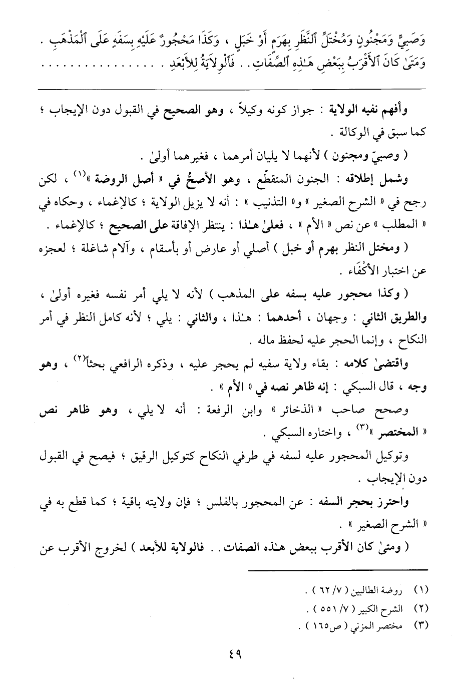 (وكذا محجور عليه بسفه على المذهب) لأنه لا يلي أمر نفسه فغيره أولى، والطريق الثاني: وجهان، أحدهما: هذا، والثاني: يلي؛ لأنه كامل النظر في أمر النكاح، وإنما الحجر عليه لحفظ ماله.
