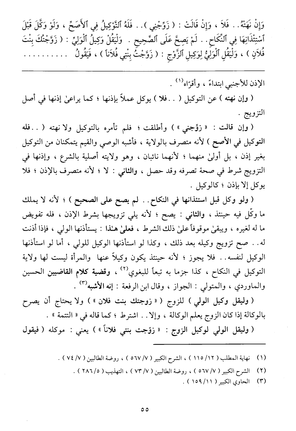 (ولو وكل قبل استئذانها في النكاح .. لم يصح على الصحيح)؛ لأنه لا يملك ما وكّل فيه حينئذ، والثاني: يصح؛ لأنه يلي تزويجها بشرط الإذن، فله تفويض ما له لغيره، ويبقى موقوفًا على ذلك الشرط، فعلى هذا: يستأذنها الولي، فإذا أذنت له .. صح تزويج وكيله بعد ذلك، وكذا لو استأذنها الوكيل للولي، أما لو استأذنها الوكيل لنفسه .. فلا يجوز؛ لأنه حينئذ يكون وكيلًا عنها والمرأة ليست لها ولاية التوكيل في النكاح، كذا جزما به تبعًا للبغوي (٢)، وقضية كلام القاضيين الحسين والماوردي، والمتولي: الجواز، وقال ابن الرفعة: إنه الأشبه (٣).
