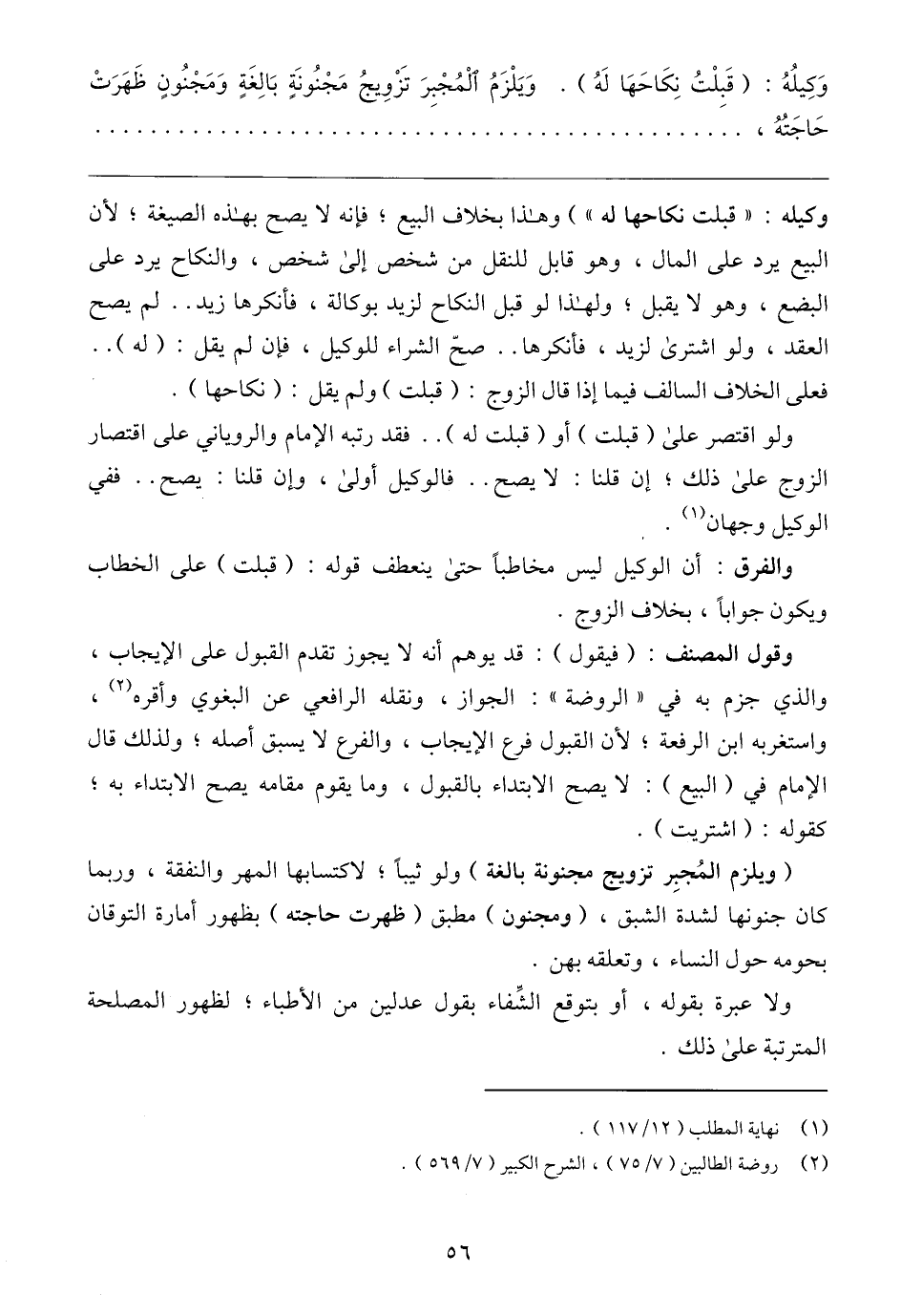 وكيله: "قبلت نكاحها له") وهذا بخلاف البيع؛ فإنه لا يصح بهذه الصيغة؛ لأن البيع يرد على المال، وهو قابل للنقل من شخص إلى شخص، والنكاح يرد على البضع، وهو لا يقبل؛ ولهذا لو قبل النكاح لزيد بوكالة، فأنكرها زيد .. لم يصح العقد، ولو اشترى لزيد، فأنكرها .. صحّ الشراء للوكيل، فإن لم يقل: (له) .. فعلى الخلاف السالف فيما إذا قال الزوج: (قبلت) ولم يقل: (نكاحها).